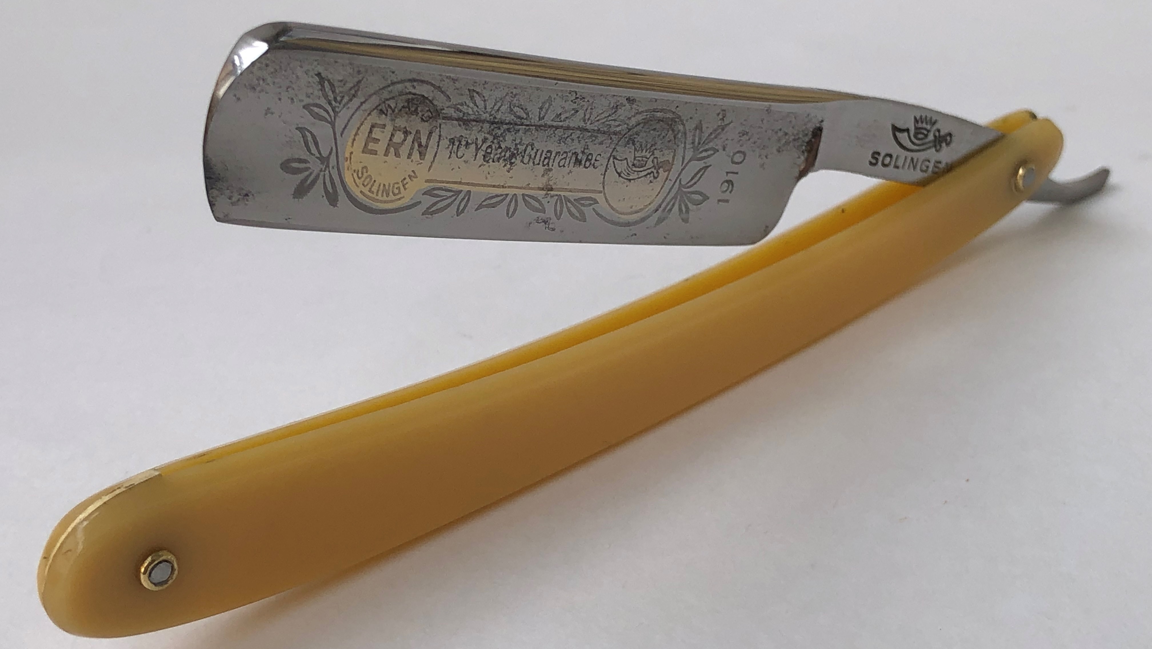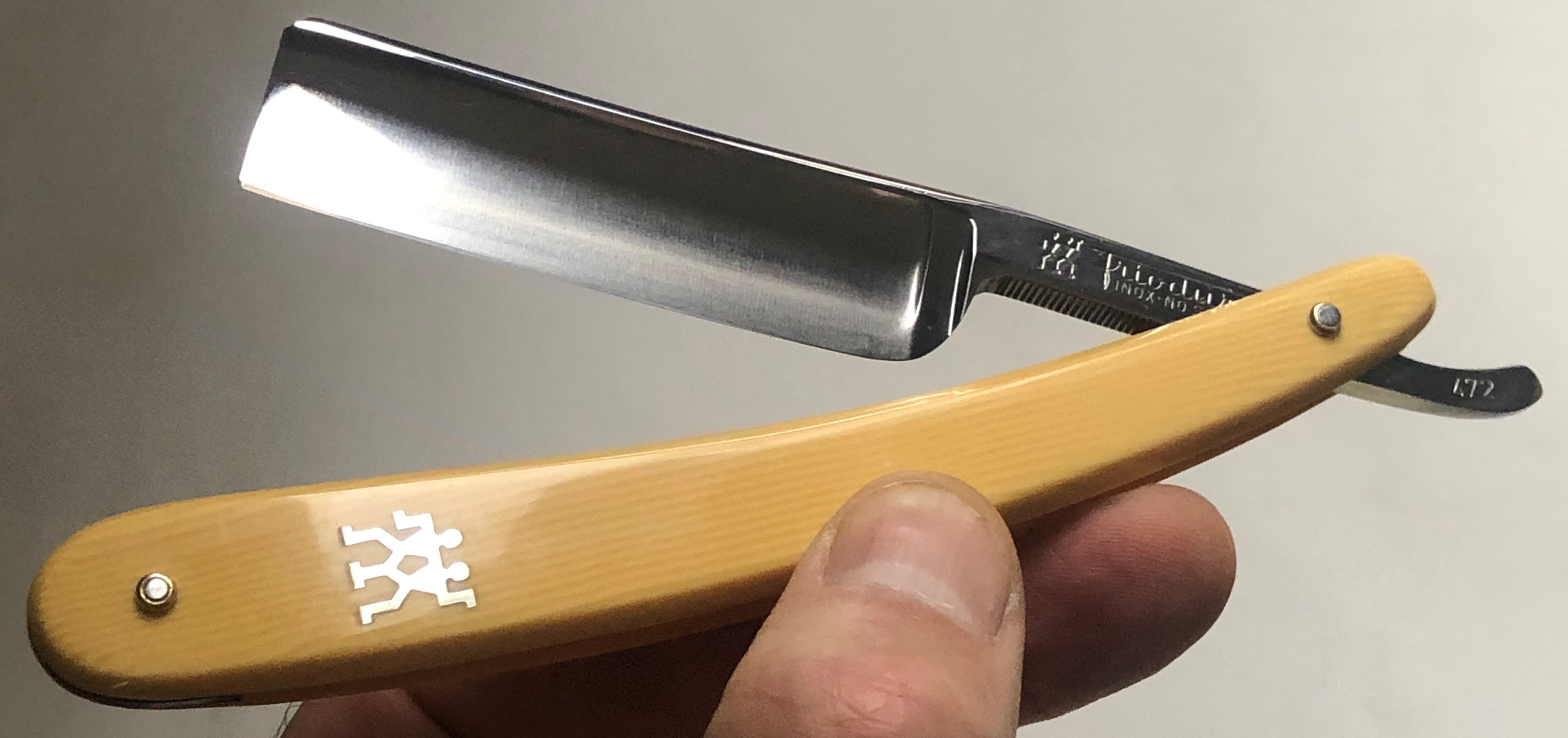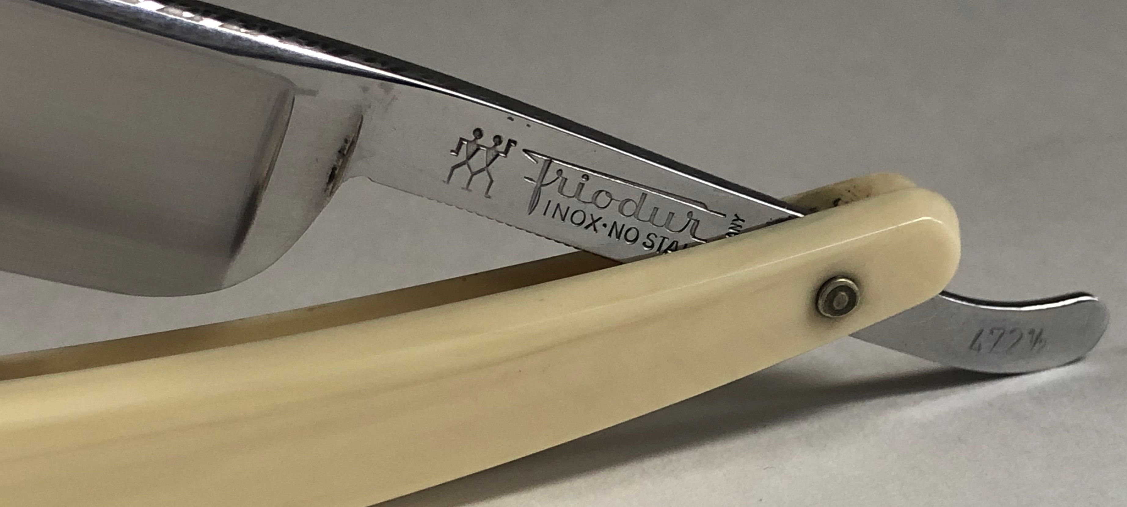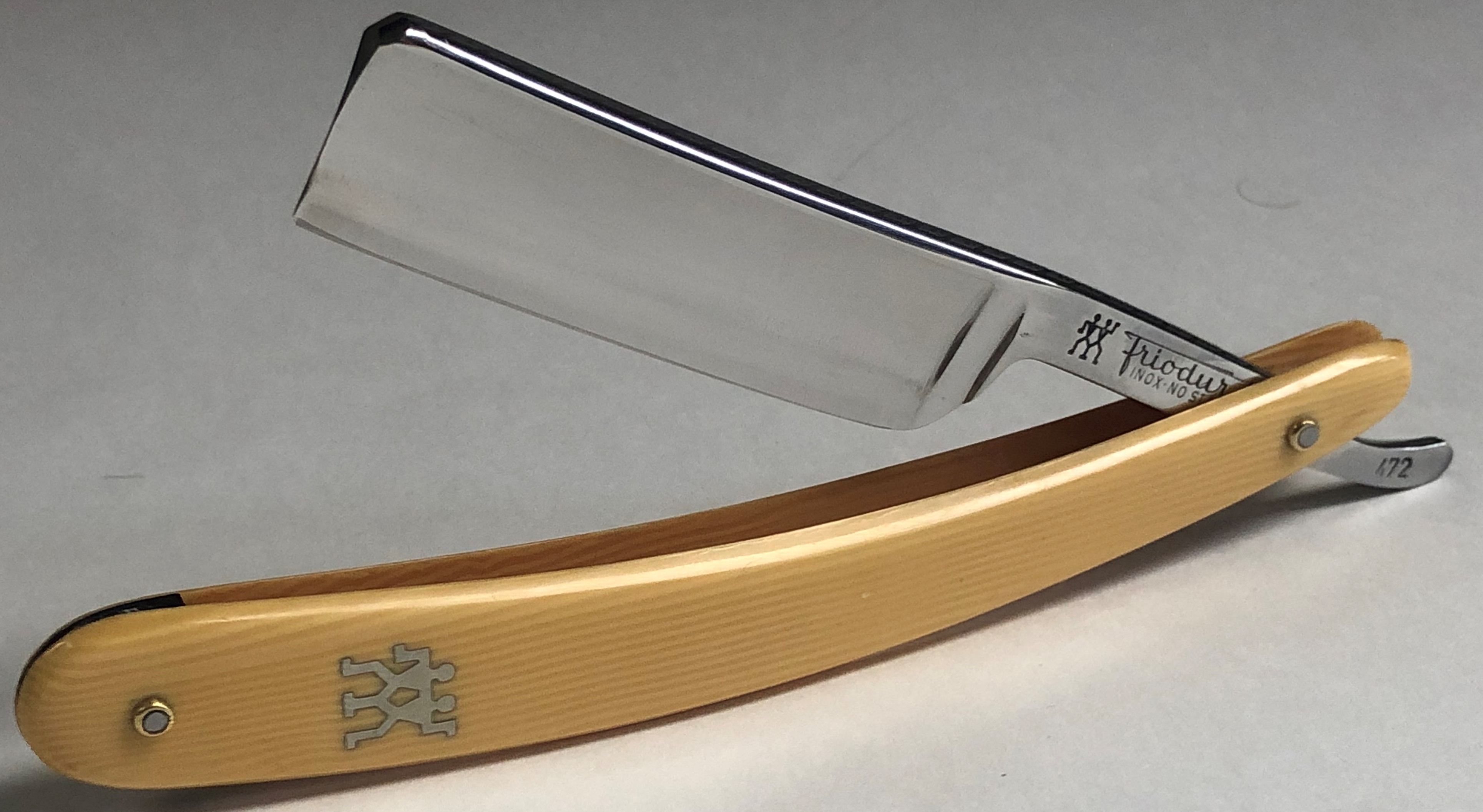 Бритва в очень хорошем состоянии, без активных и еле заметных следов пользования. Ничего не разбиралось и не ремонтировалось. Все в оригинале.Идеальная геометрия полотна.Кромочка чистая от дефектов. Несколько незначительных "точек времени" не стал трогать за ненужностью.Удобная форма клинка. Достаточно тяжелая.Эффектный, ажурный обушок.Очень неплохой вариант для коллекции и для бритья. Исходя из своего опыта могу сказать, что именно нержавеющие стали Фриодур были наиболее подходящие для бритв.