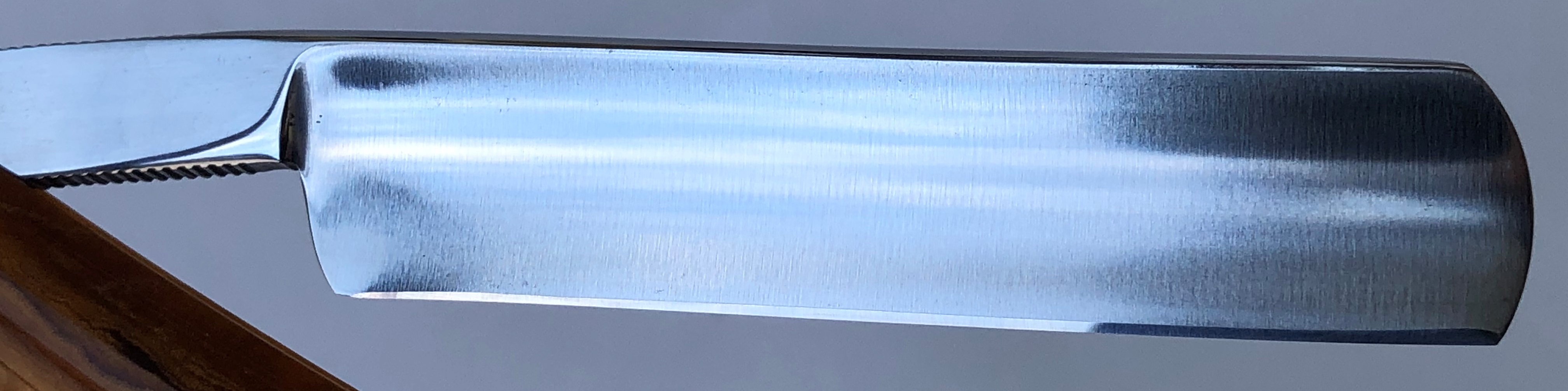 Попробовал вдохнуть вторую жизнь в старушку.Разобрал, откорректировал утОчку обушка и исправил небольшую "обратную улыбку".Скошенная пятка в результате удаления скола.Умеренная полировка.Кромка сейчас равномерна по всей длине. Оставил немного красивого налета патины на эрле. Неглубокую трещинку на ручке также хорошо проклеил.В общем и целом получалась неплохая, недорогая и удобная бритва. Заточена и готова к бритью.