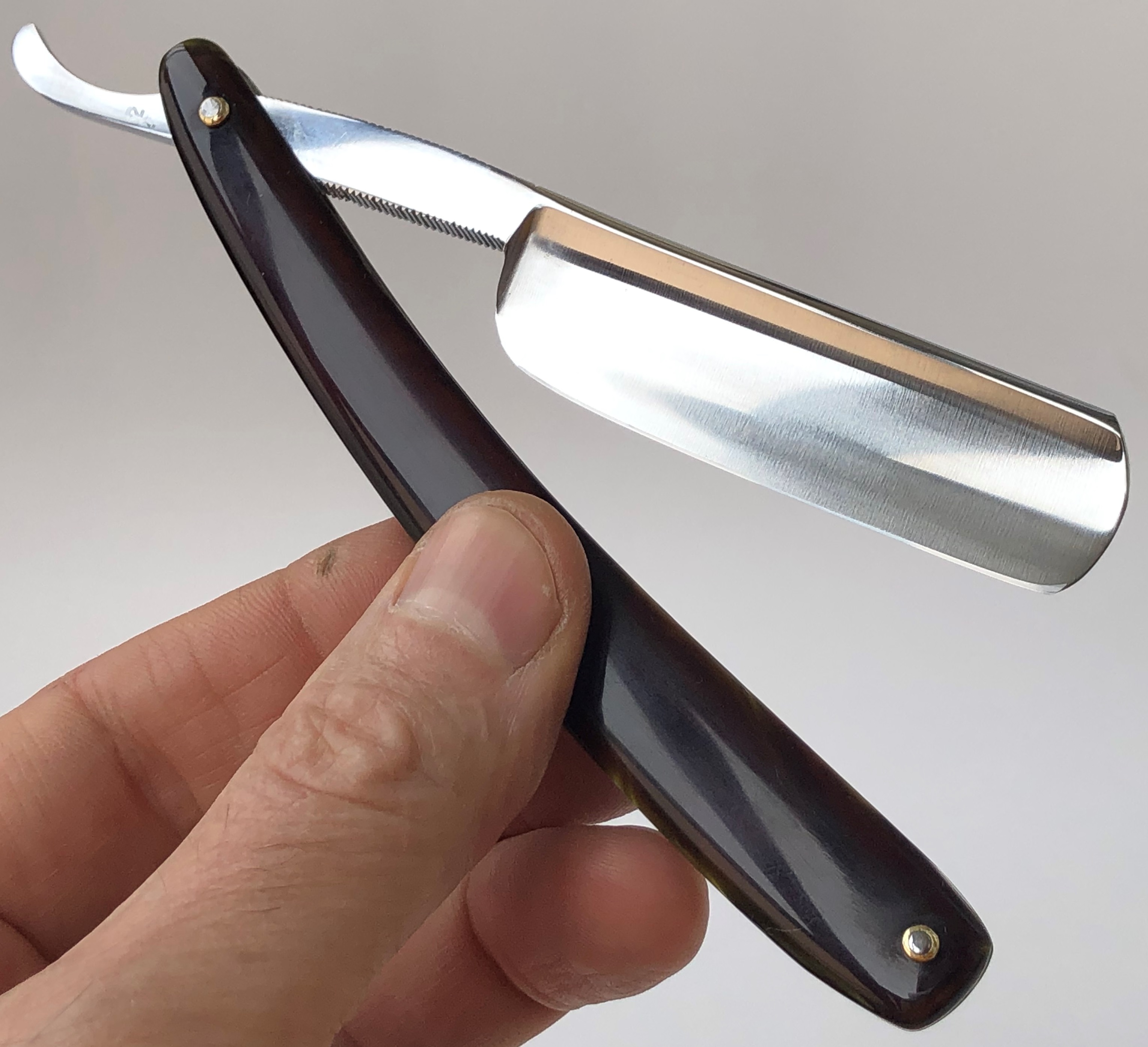 Бритва в прекрасном состоянии, с минимальными следами пользования.Была разобрана для добавления внутренних шайб, с сохранением родного осевого пина.Оригинальная шлифовка и полировка клинка.Идеальная геометрия полотна:кромочка равномерна по всей длине.