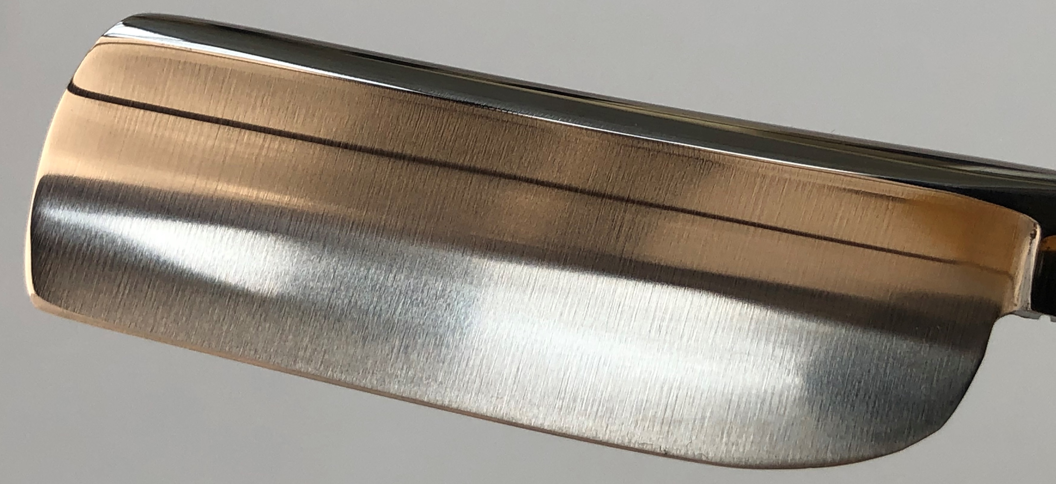 По всей видимости бритва в пользовании не была, судя по отсутствию утОчки обушка. Никакого регринда не производил. Только минимальное освежение металла от древней патины.Поменял пины на двух-цветный втулки, с добавлением внутренних шайб.Идеальная геометрия полотна:кромочка равномерна по всей длине и еле заметна.Шикарная укороченная, профессиональная бритва.Состояние новой. Не пропустите!