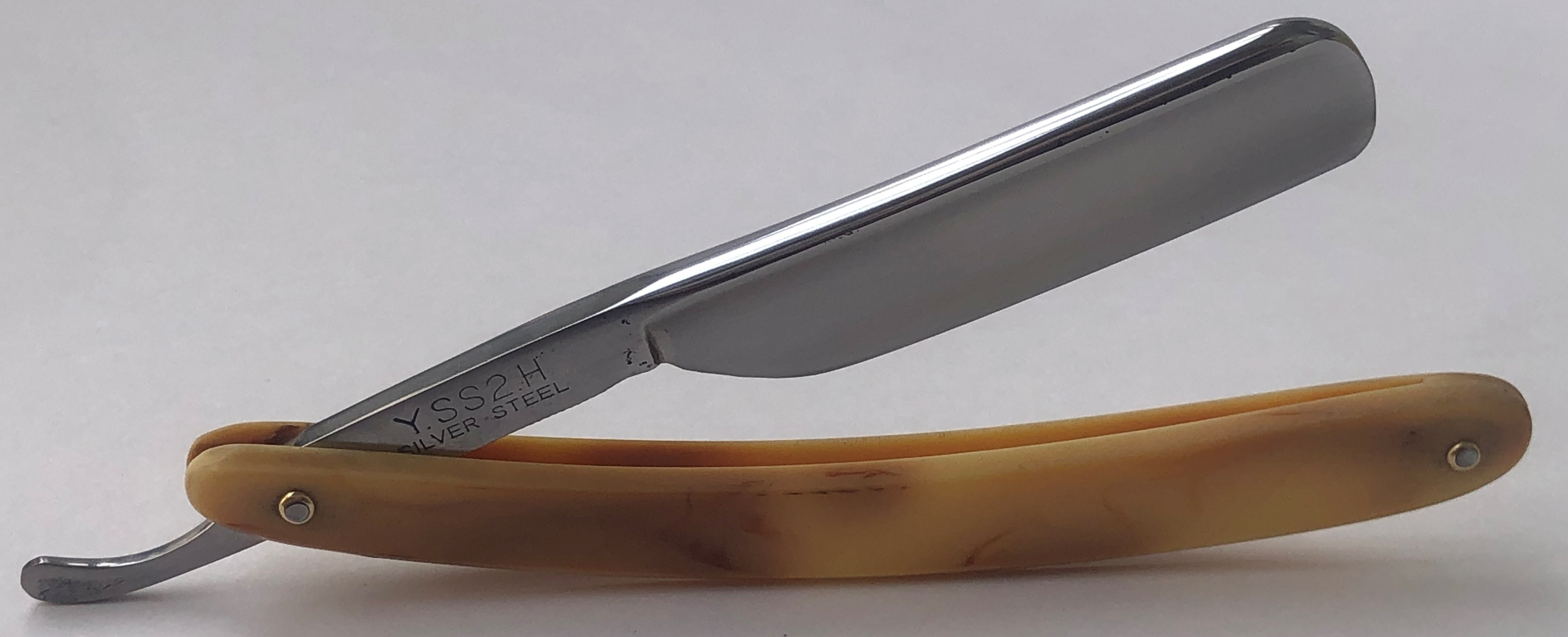 Бритва в пользовании не была. Не имеет следов утОчки обушка и утраты ширины полотна.Была разобрана для минимальных косметических работ, по удалению старинной патины и микро царапин.Новые втулки вместо пинов, а также добавлены внутренние шайбы.Шлифовка "под завод" и умеренная полировка.Идеальная геометрия полотна:кромочка равномерна по всей длине и еле заметна.Самая удачная и удобная модель от SK. Не пропустите реально редкую , красивую и практичную вещь для своей коллекции.