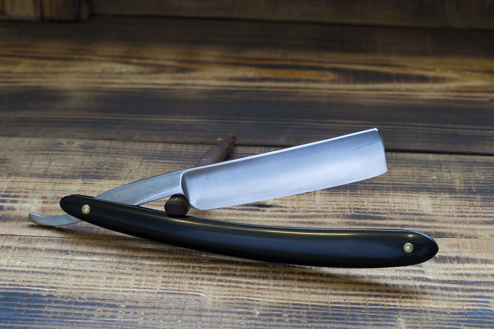 Опасная бритва от Джозефа Востенхольма торговой марки Ebro. Бритва имеет довольно скромные размеры в 5/8 (16.6 мм.), вогнутость полотна примерно 1/2, роговая рукоять, немного длинная, но я уверен что родная, так как не было замечено каких либо следов перестановки - оба пина были одинаковыми, аутентичные латунные шайбы, которые удалось сохранить. Бритва точилась мало и аккуратно, поэтому размер полотна близок к оригинальному. На эрле присутствует клеймо England, что может смутить любителей датировки бритв по Standart Guide, несмотря на его наличие я уверен что бритва выпущена ранее 1890-х, а именно дата выпуска примерно 1860 - 70 гг, об этом говорит и период работы фабрики, и форма полотна в сочетании с материалом рукояти. Бритва имеет прекрасную геометрию - фаска тонкая и равномерная по всей длине, углеродистая сталь высокого качества хорошо проявившая себя в заточке. Бритва крайне интересна, особенно рекомендую новичкам, так же будет удобна при окантовке. Продано EBRO Show