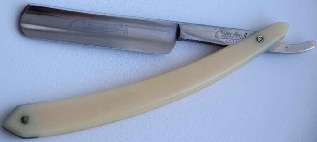 Ширина полотна-17.5 мм Толщина обушка-4 мм Полная вогнутость. Углеродистая сталь. Бритва в нетронутом состоянии и изначально была с заводской заточкой.Бритву переточил, с использованием изоленты.Геометрия идеальная, кромочка равномерна по всей длине. Сталь чистая, без видимых дефектов.Бритва не разбиралась и не ремонтировалась.Родная коробочка в комплекте. Неплохой и недорогой вариант для новичка, а также в коллекцию. Цена-3500 р с доставкойПРОДАН Также, не пропустите отличный "Росинструмент" 30-40-х годов. viewtopic.php?f=7&t=5399&start=760
