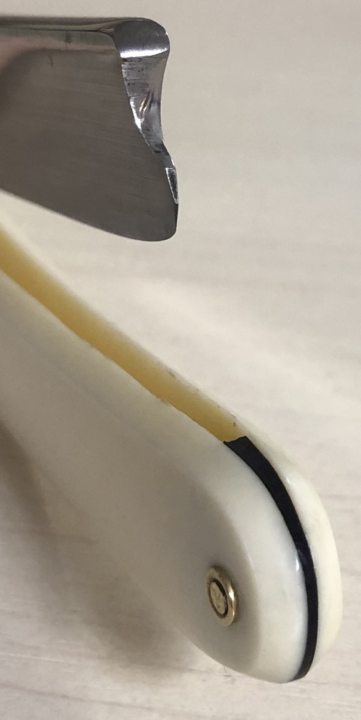 Бритва в прекрасном состоянии, без видимых следов пользования. Разобрал, немного прошёлся самыми тонкими абразивами и снова собрал, заменив пины на немецкие двух-цветные втулки, с добавлением внутренних шайб. Родная оправа также в отличном состоянии. Идеальная геометрия:кромочка равномерна по всей длине и еле заметна. Отличный, достаточно редкий экземпляр, в таком сохране. Не пропустите очень хорошую и недорогую вещь.