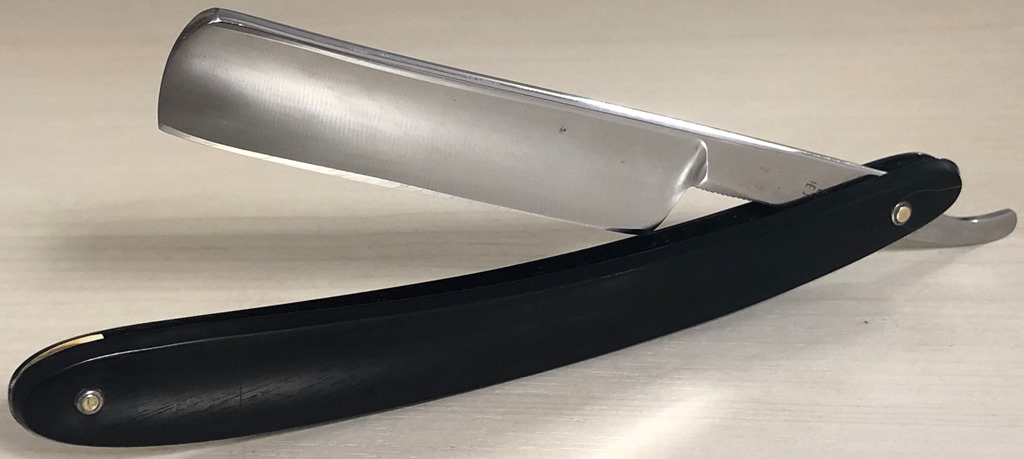 Красивая и практичная бритва.Поменял осевой пин, так как закрывалась бритва криво изначально, заодно и второй пин заменил, для порядка.Клинок не имеет следов пользования.Немного освежил металл и все. Идеальная геометрия. Кромочка равномерна по всей длине.За счет пластиковых накладок бритва не требует излишнего ухода, да и эстетически смотрится очень приятно.Клинок среднего размера, скупе с довольно ощутимым весом будет отличным вариантом для новичка и не только.Заточена и готова к бритью.