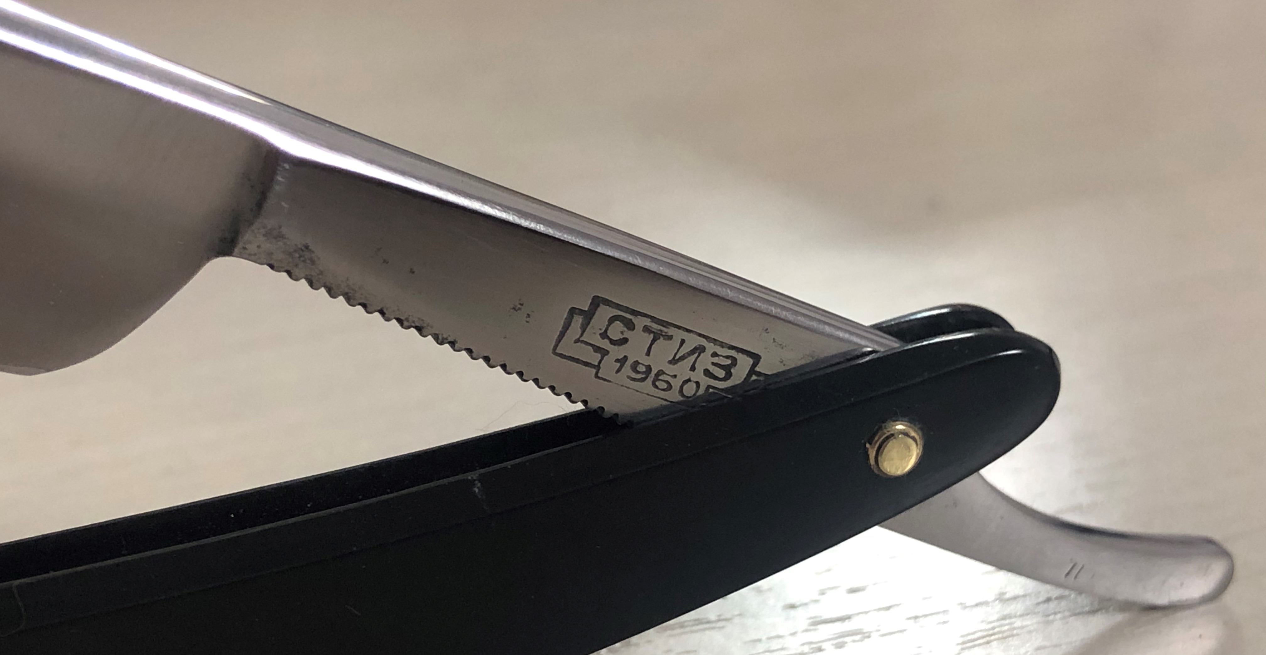 Бритва в пользовании не была, но требовала разборки и чистки клинка от разного рода патины и окисления металла. Родной осевой пин удалось поставить обратно, как и примерно воссоздать "оригинальную" шлифовку полотна.Как по мне, бритва сейчас находится в очень хорошем состоянии, близком к идеальному. Сталь чистая, геометрия также идеальная. Кромочка еле заметна и равномерна по всей длине.Приятно выраженный изгиб обушка.Коробочка хоть и от стиза, но от другом модели.Но, чем богаты, как говориться.Отличный недорогой вариант как в коллекцию, так и для новичка.