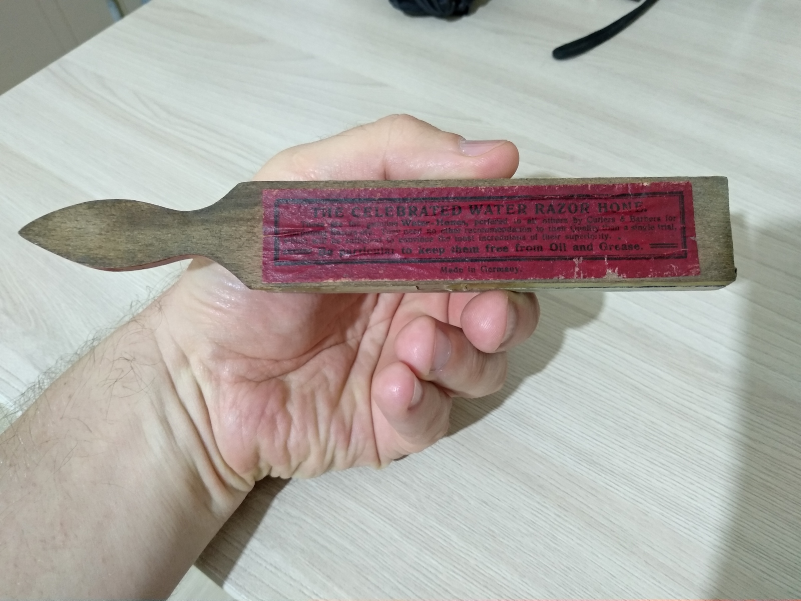 Одноразовая продажа с разрешения администрацииТюрингиец, тонкий, твердый, размер, по-видимому Barbers Gem 124x62x20 мм. Суспензию для фото натирал на обратной стороне. Рабочая сторона, честно признаюсь, не идеальная, я им почти не пользовался, мне больше понравились зеленые, если важно - перед отправкой все выровняю. Цена 16000 руб. + доставка.
