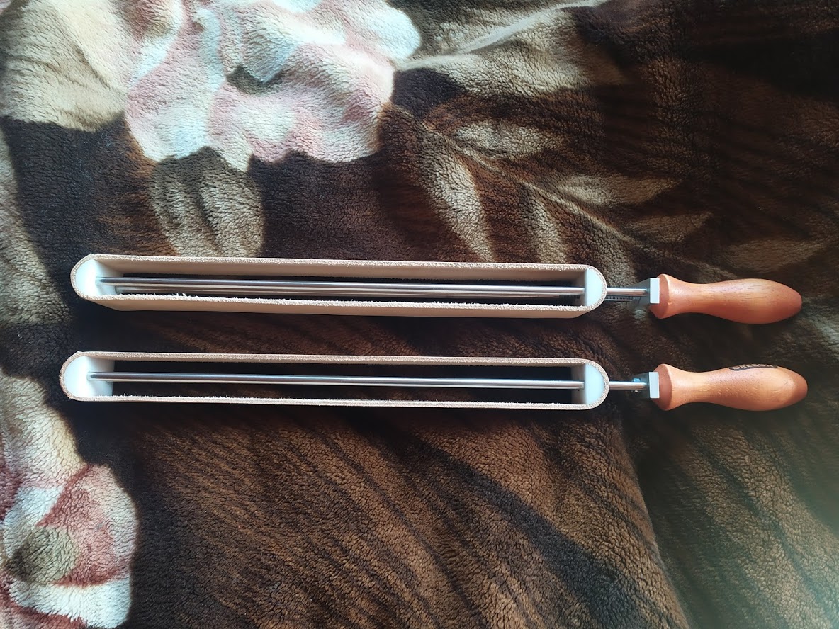 Продам натяжные ремни для правки. Длина ремней 35см, ширина одного 40мм, другого 45мм. Цена 3200р и 3500р соответственно. Направляющие нержавейка, полуролики из капролона (+ в натяжном латунная втулка, где ходит резьбовая шпилька), упорная планка направляющих дюраль, ручка из бразильского ореха (так заявлено в описании, ручка покупная). Кожа использована итальянская растительного дубления, обработана по методике Касуке Ивасаки. Возможна отправка почтой или СДЭКом за счет покупателя. По желанию могу нанести на одну сторону ремня красный Dialux.
