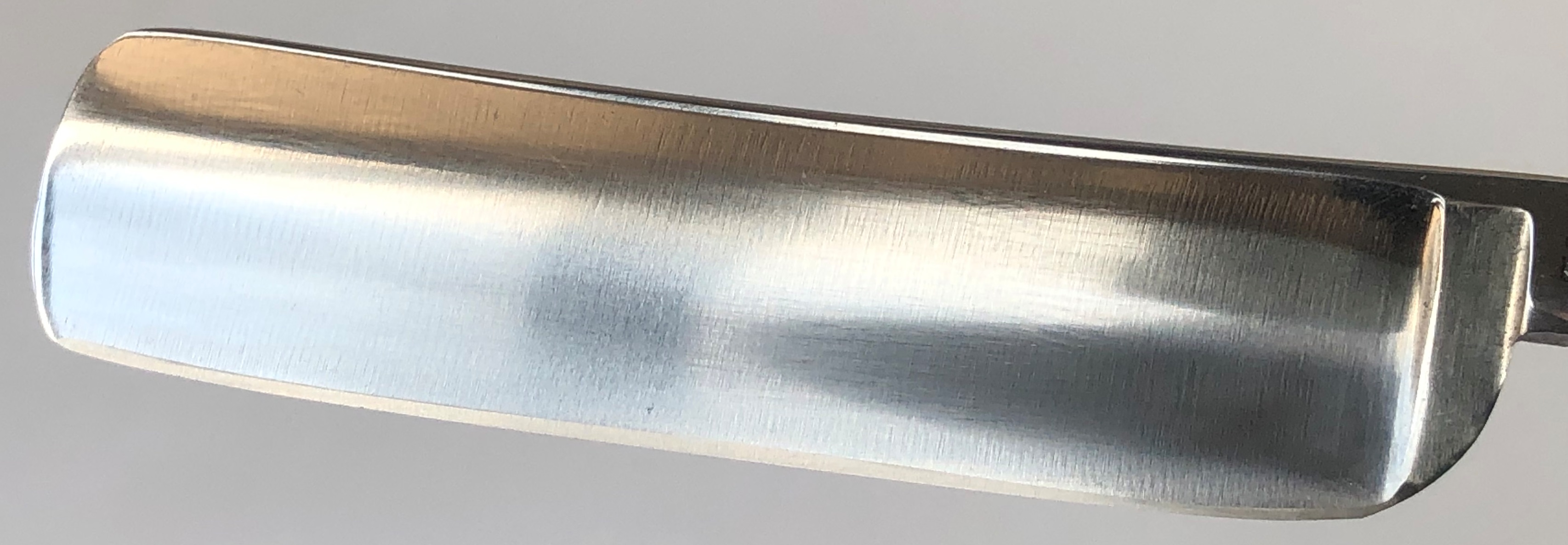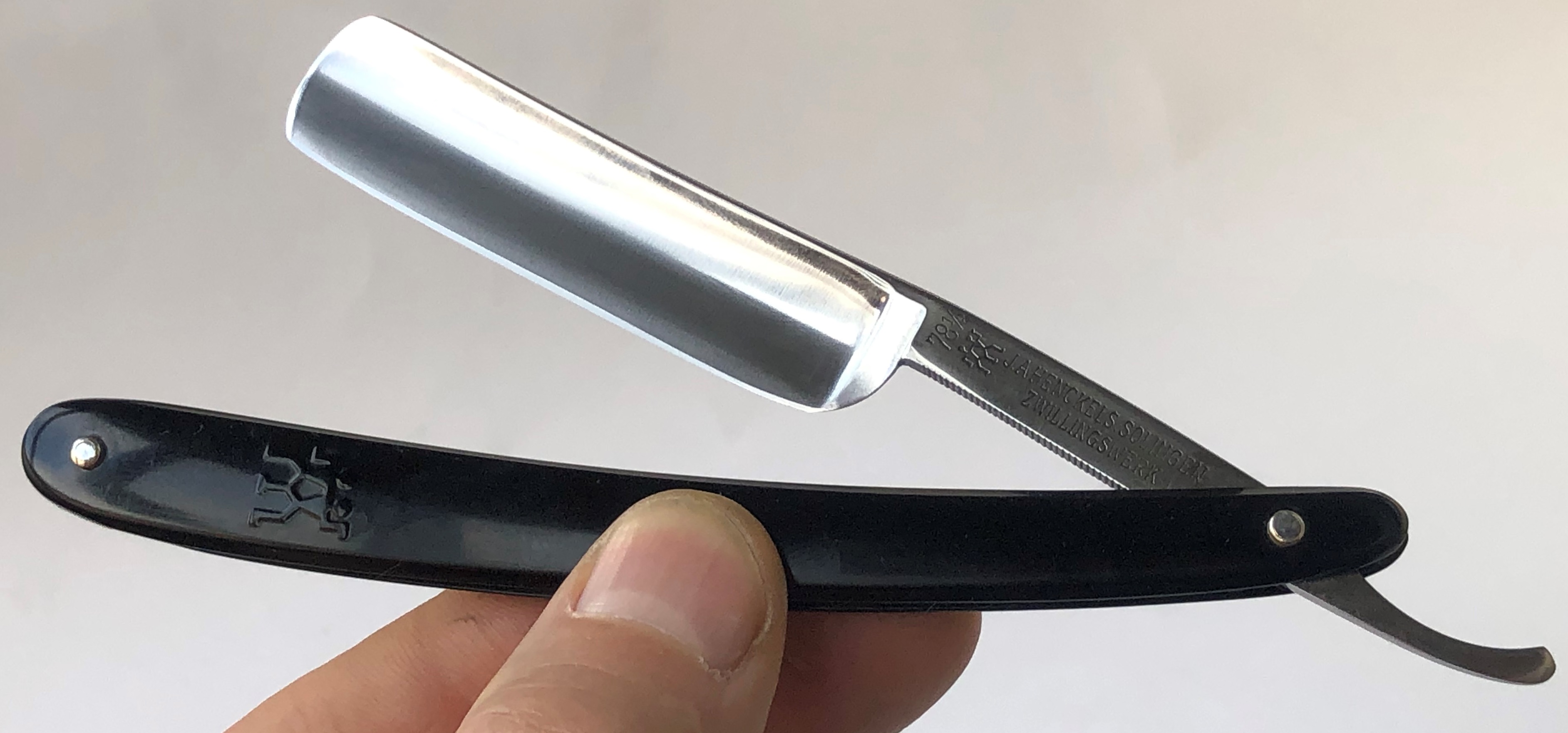 Ширина полотна-20.0 мм. Толщина обушка=5.8 мм. Полная вогнутость. Углеродистая сталь. Судя по всему это начало прошлого века. Клинок имел остатки старой сломанной оправы, с надписью "solingen".Сам клинок находится в очень приличном и аккуратно пользованном состоянии.Полотно было почищено(без регринда) и умеренно отполировано. Идеальная геометрия:кромочка равномерна по всей длине.Не долго думая,раскопал старую ,мощную немецкую ручку "под черепаху", от Бисмарка.Немного неестественно смотрится толстенный эрль относительно плашек ручки, но в общем и целом бритва получилась неплохой, особенно с клинком из высококачественной стали.Бритва достаточно крупная , с удобным хватом.Заточена и готова к бритью. Цена-10500 р с доставкой.ПРОДАН Spoiler Show
