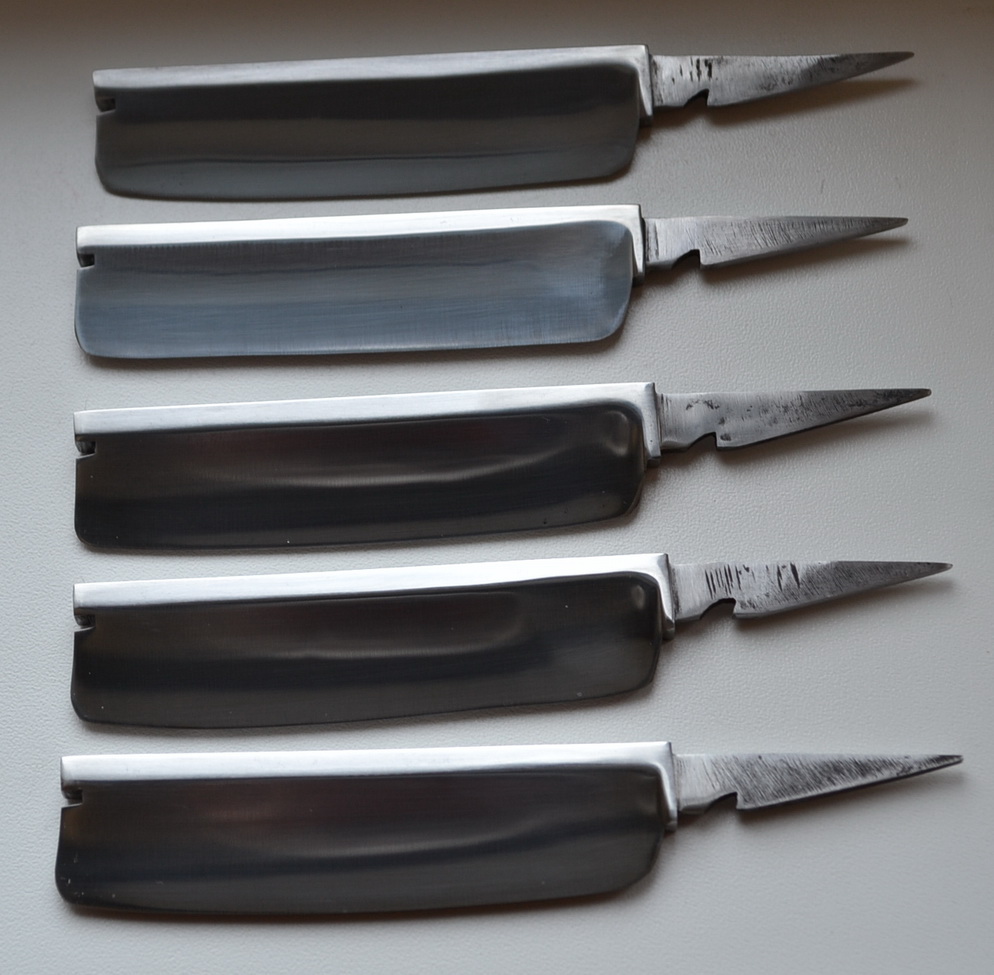 Клинки кованы вручную, геометрия просто обалдеть. Практически идеал. И это первая половина 19го века. Вот такой Марцеллот. А так как было их всего пять. То решил я сделать их полноценными бритвами. Вот что из этого вышло. Добавлено спустя 2 минуты 16 секунд: Продолжу. Хвостовики-это отдельная кропотливая и занудная работа. Спасибо нашлись помощники. Об этом потом. Добавлено спустя 1 минуту 19 секунд: И вот проект близится к завершению.