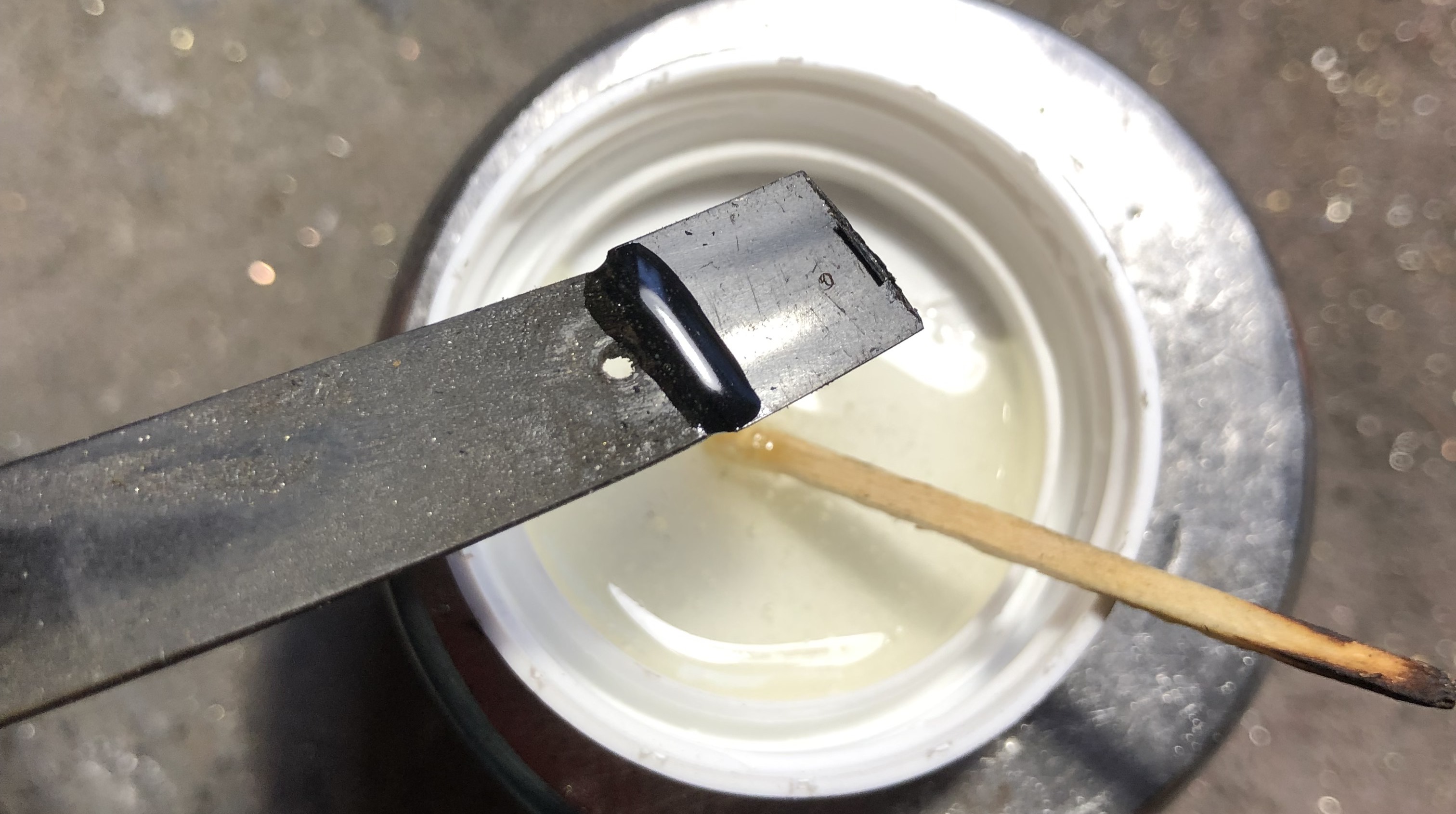 1.Бритву разобрал, пропилил напильником или надфилем неровность от скола. Нашел более менее подходящий по цвету кусочек от донора и также выровнил на нем место склейки.