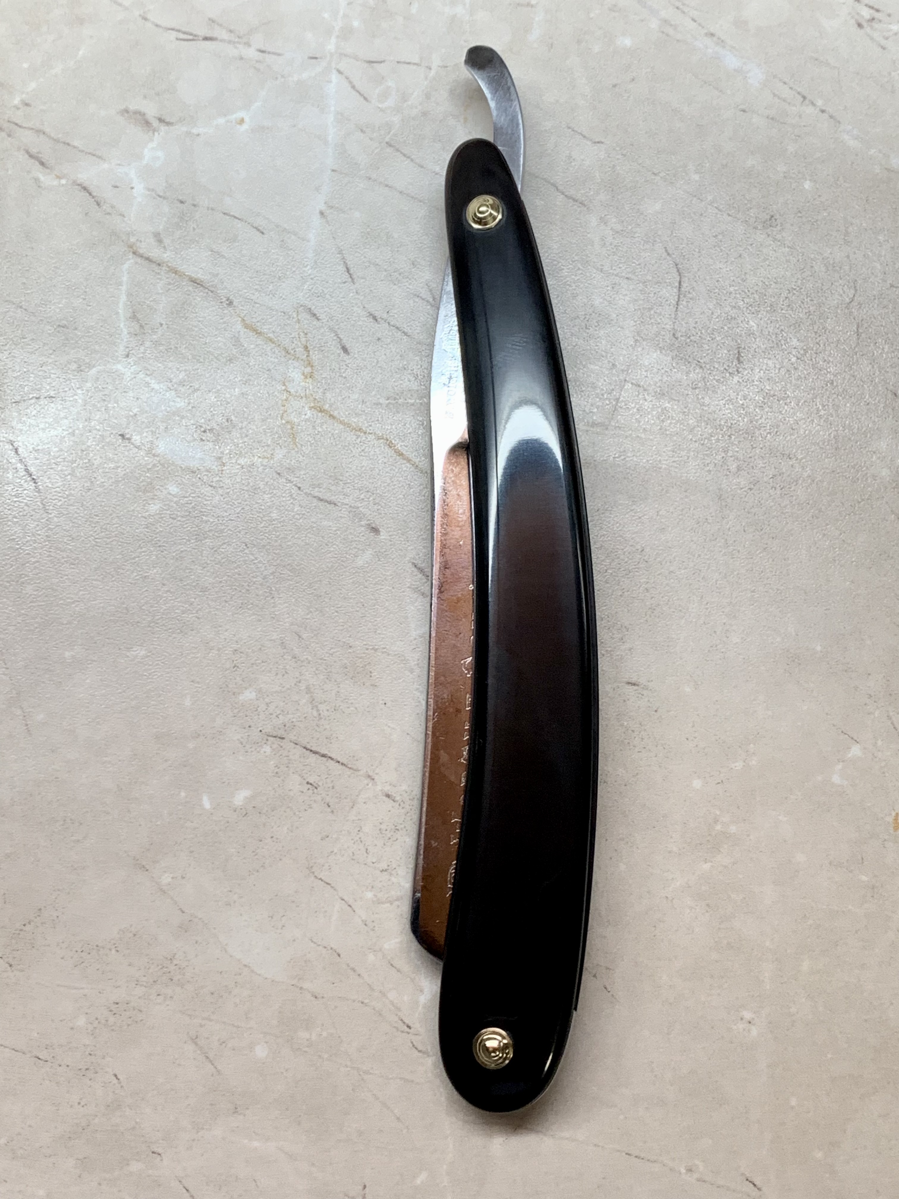 Датировать бритовку не могу, такая же Leresche et Cie проскакивала здесь в продажах у Boris (viewtopic.php?f=7&t=4441&p=85478&hilit=leresche#p85478). На хвостике выбиты цифры 60-4; может год выпуска, может модель... Досталась в жутком ржавом состоянии, но благодаря выборке в четверть, "мяса" для регринда осталось достаточно, да и коррозия на РК не выходит.