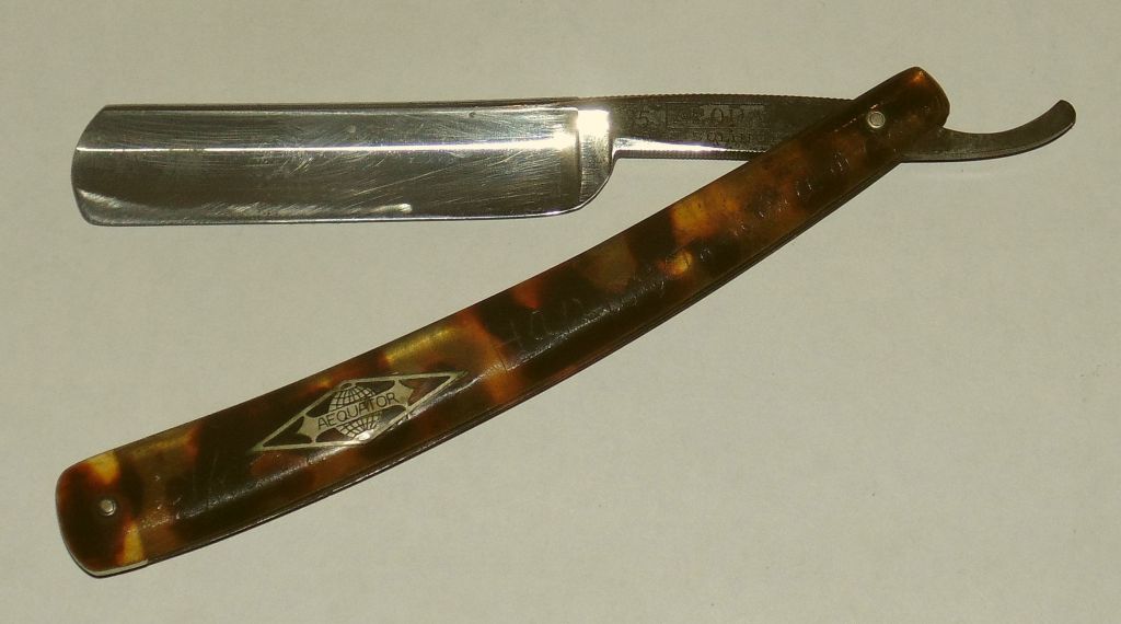 Фотки от продавца на ебее (свои уже где-то потерял): Фотки до начала работы Show - сильная коррозия; - грязь под ручкой; - ручка не закрывается ровно; - брак осевого пина (отверстие на заводе просверлили не ровно); Бритва extra hollow ground, поэтому металла побоялся много снимать. Травление на полотне решено было убрать вместе с коррозией. Зачистил алмазной резинкой, потом наждачками. Отполировал до зеркала. Ручка была разобрана (без вреда для ручки и шайб), вычищена. Чтобы устранить заводской брак (перекос пина) пришлось рассверливать отверстие под пин. К сожалению заводские шайбы по внутреннему диаметру не налезли на новую заклепку большего диаметра. Поэтому шайбы подобрал новые. Теперь закрывается ровно. Фото результата Show