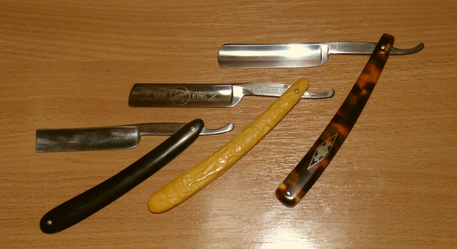 Aequator была с глубокими царапинами на ручке. Kaufmann был без ручки. Engels вроде в родной оправе был, но сломанной , пришлось укорачивать, да в добавок скол РК ~ 1.5 мм. Ржа была глубокой, сошло травление на полотне. Все бритвы распиновывались. Шайбы сохранены родные, а стержни сделаны из верхушки телескопической антенны путем стачивания до нужного диаметра.
