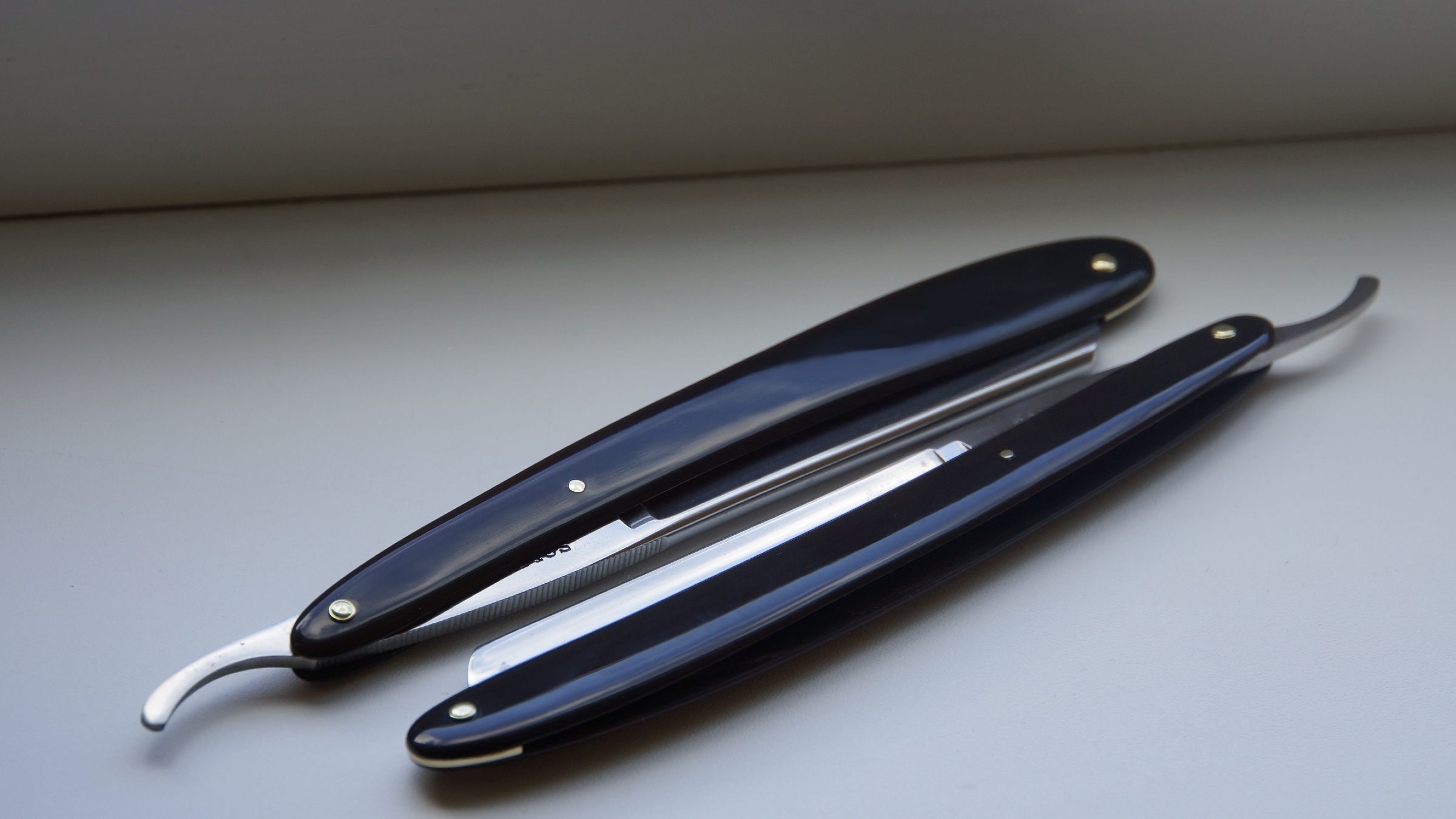 Просто две одинаковые безымянные бритвы с клеймом Solingen, но из арсенала ProhorP - самые любимые. Ручки - рог (отдельное спасибо уважаемому Boris за любезное предоставление отличного материала). Заклепки, проставочные шайбы, вкладыш-клинышек, а также "бочонок" под третьим пином - латунь, по просьбе заказчика. Solingen Show
