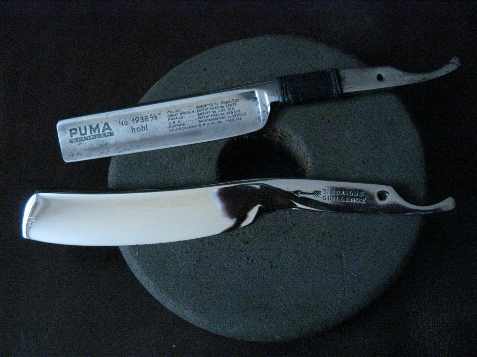 Принес тут товарисч, решивший избавится от раздражения после бритья кардинальным способом, две бритвочки - дедовского СТИЗа и прадедовскую Пуму. Стиз то только почистить-заточить, а вот Пума достойна восстановления для потомков. Вопрос в чем - ручка Пумы с трещинами, буквально расколота (видно по фото). Но она в металлической оправке, вот как бы новую ручку да аккуратненько в эту же оправу вставить? Улыбайтесь!