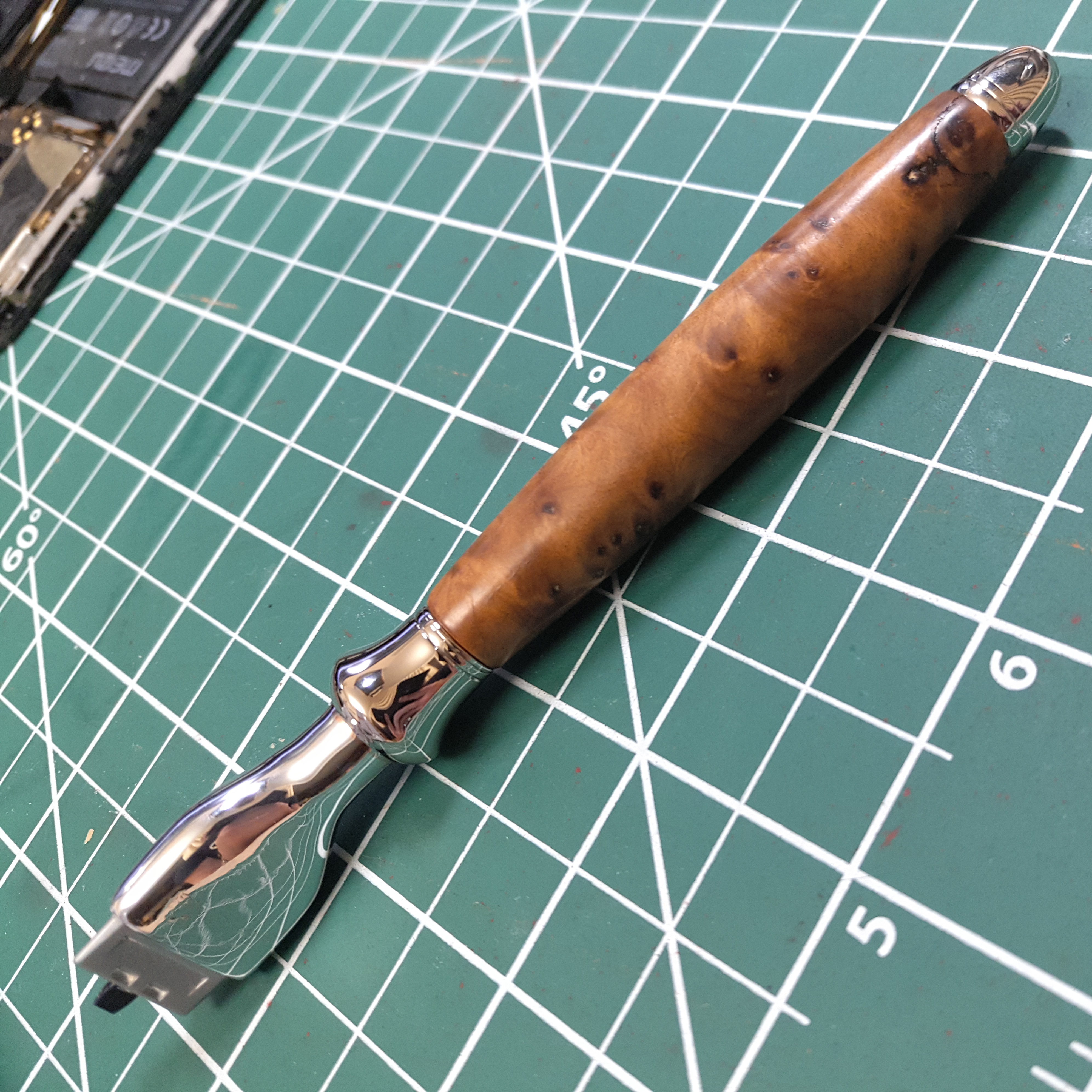 Сдали в ремонт, стилизованную под Gillette Mach 3, рукоять The Art of Shaving (на самом деле то ли Muele Pinsel, то ли Edvin Jagger). Смысл ремонта - проворачивалась вокруг оси деревянная вставка. Задача - закрепить, приклеить, что-то сделать чтобы не крутилась.