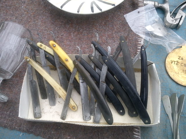 Re: Уличные рынки в разных городах.Был на днях в Праге.Посетил самый большой Пражский блошиный рынок Колбенова.По бритвам голяк.Лежат кучки сточенных ржавых бритв...3-5 мм шириной от силы.Видно старые чехи были экономные ребята...До упора бритву уделовали.В центре в антиках такая же картина...Убитые бритвы...Ничего не нашел...почти.В основном торгуют стеклом.Графины,вазы,рюмки и тд...при чем не очень то и дешево...Вообщем пришлось затариваться графинами...не с пустыми же руками ехать назад
