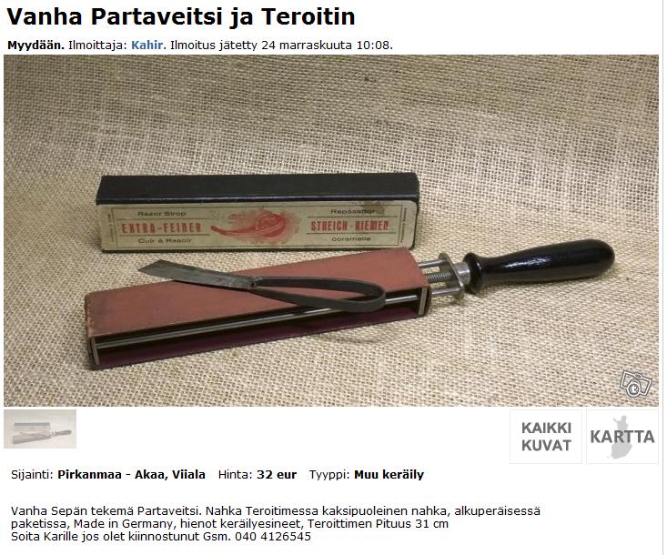 В объявлении читаем: "старая кованая кузнецом опасная бритва." Ну и в придачу ремень. Может и не развод никакой (в смысле может кто и ковал сам) Или просто приварили к железке в виде ножика кусок мет. полоски и это стало типa опасной бритвой. http://www.tori.fi/pirkanmaa/Vanha_Part ... ?ca=18&w=3" onclick="window.open(this.href);return false;