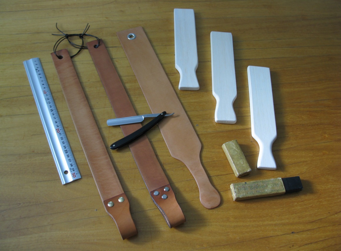 1. набор для правки - борд+ремень - из классной не толстой кожи - 1500+200, если выточить ручку, то +300руб, но на ширине 50мм это не нужно, можно прямо так.