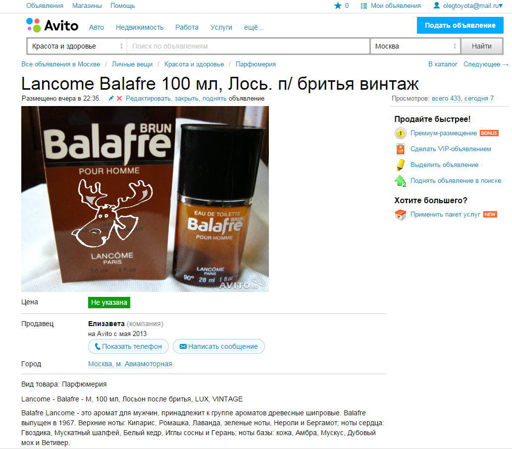Re: Аукционы: плагиат, развод и "великолепные" описания"Lancome Balafre 100 мл, Лось. п/ бритья винтаж" на Авито.