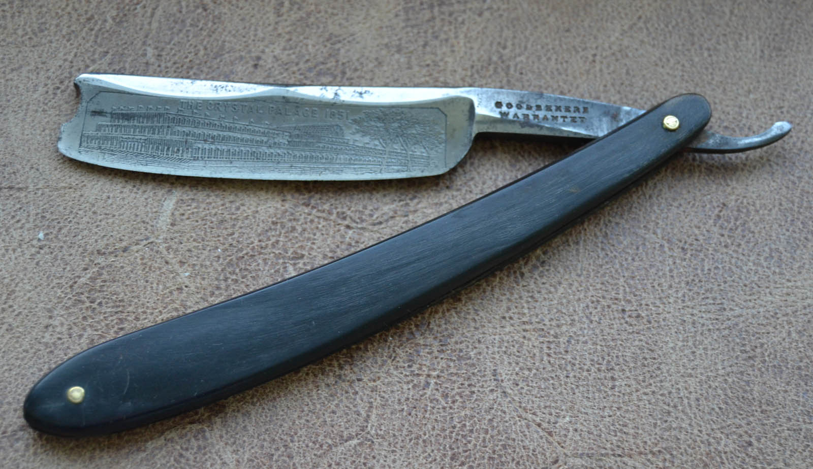 Газета Morning chronicle, 2 апреля 1851 года, сообщение об участниках выставки. G.T.Goodbehere, эсквайр, представил на Выставке 2 экземпляра товара. Так, что, твоя бритва, очевидно, одна из этих двух. Датировка ясна - ранее апреля 1851 года. Прошу обращаться ко мне на "ТЫ". На "ВЫ", только, если хотите со мной ругаться, либо пытаться в общении со мной повысить своё ЧСВ.