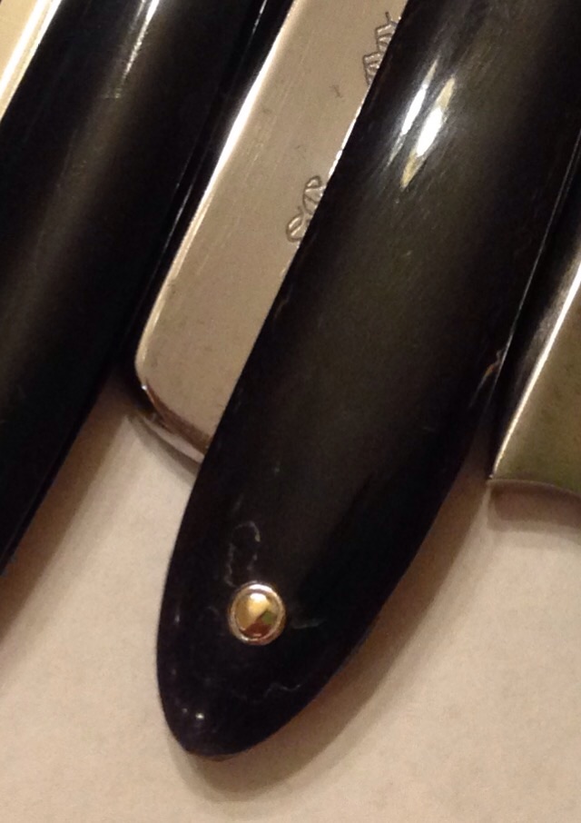 Мне тоже вначале так показалось. Подумал, что какой то таинственный прошлый владелец подточил рок и филигранно подогнал оковку, дабы починить бритву, после того как она получила трещину по нижнему пину. Но после разборки понял что ошибся. Скорее всего бритва имела этот набалдашник с самого рождения. Обратите внимание на производителя, бьюсь об заклад, многие видят его впервые, как и я. Всем известен Джозеф Аллен и его сыновья, Джона Аллена я не встречал до селе. Так же и не встречал такой любопытной рукояти. Итак, как это было сделано. Из какого то тонкого листового металла, так и не понял что это за металл, была изготовлена оковка. В нее вставлены половинки рукояти и тут самое интересное, я думаю, что в щель между рукоятями был залит расплав, об этом кстати свидетельствуют пустоты внутри клинышка. Жаль не сфотографировал оковку изнутри, там они явно видны в клинышке, образовавшиеся из за пузырьков воздуха. Да и рукоять удалось достать лишь частично, из за трещины пина. Иначе ни о какой разборке речи бы не шло. В общем еще одна забавная технология, так и не получившая распространения.