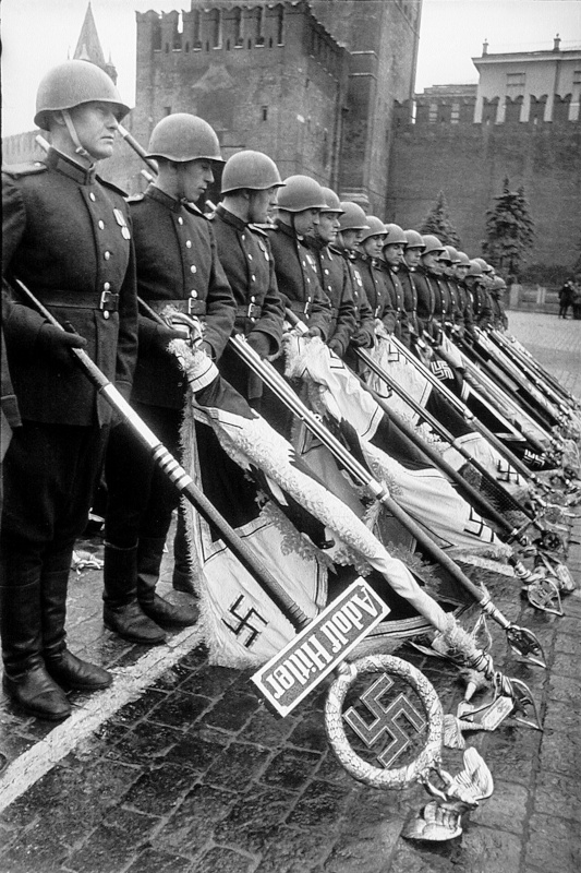 Re: Тема поздравлений.Вот тоже зачетная фотка, наш парад, первый штандарт я так понимаю от LSSAH (элитная СС дивизия №1 "телохранители Гитлера") настоящий конечно у французов или поляков, а наши муляж слепили для понта...