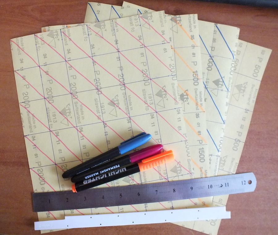 Тоже в основном использую наждачку SIA, а также Smirdex (P2000-3000). Правда градацию использую немного другую: P180, P240, P400, P600, P800, P1000, P2000, P2500, P3000. На сухую по моим наблюдениям съем металла идет побольше все таки. Круговые и продольные движения стараюсь не использовать, потом царапки остаются, которые ничем не выводятся.