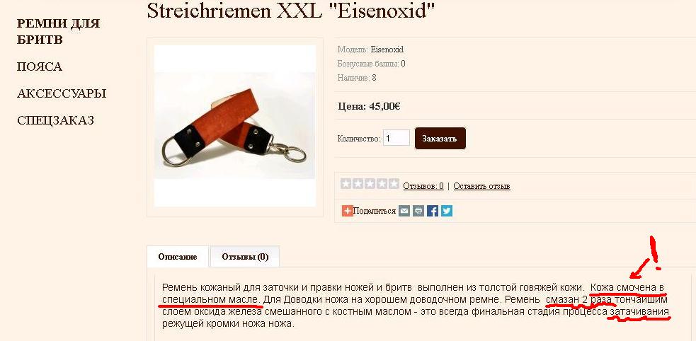Re: Продаётся от wrenРемень тяжёлый в соответствии со своей толщиной и габаритами. Весит примерно столько же,сколько обычные ремни такого размера. Зачем заливать маслом кожу? Пропитан в меру,чтобы быть мягким и эффективно работать. Царапок от правки не оставляет,т.к полотно немного надшлифовано. Почему такой ремень для новичков,в самый раз.