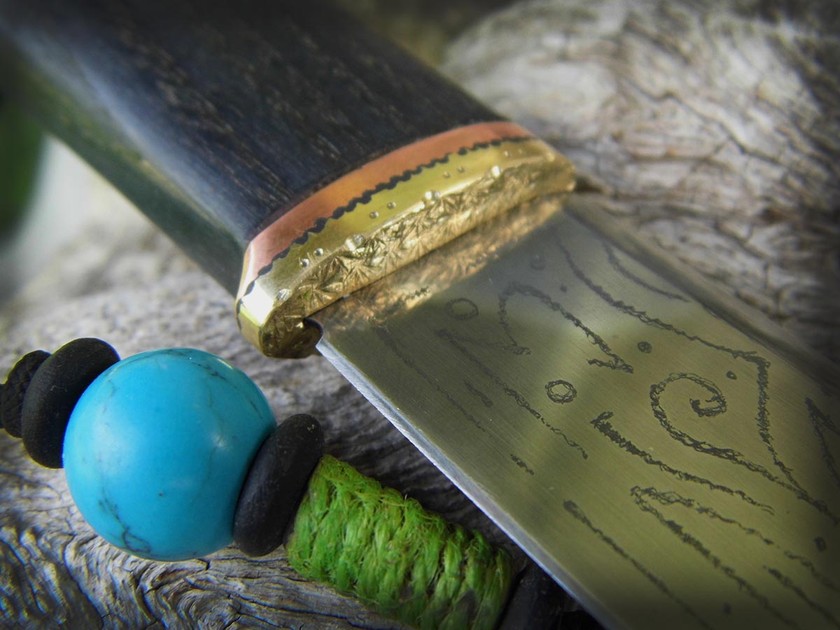 ребята варвары однако. Особо любопытные просто оказывают встречное давление режущими кромками ножей, пока на одном из них не появится замин, который уйдет при заточке, а долбить ножами друг по другу... Жесть. Недавно стал владельцем такого ножа http://forum.guns.ru/forummessage/97/1590738.html" onclick="window.open(this.href);return false; Можно сказать по случаю достался, выменял его на кое какие рога и копыта Клинок 133х29х3(ромб) , японский подшипник , 58-60HRc , травлён в х.ж. Рукоять 115 мм, латунь,медь,каштан тонированный,тикойл.Монтаж всадной на супер-хват. Бусина - бирюза. Ножны из растишки,эксклюзивный штампинг ,нить вощённая,краска Kezal ,пропитка восками на горячую. Spoiler Show Все бы ничего, сталь по ощущениям - хорошая углеродка, работа качественная, съем металла при заточке хорош, но не избыточен, сталь не вязкая. Но вот коррозионная стойкость у металла вообще отсутствует. Отрезал кус мяса, сразу протер и пошло потемнение. Есть мыслю заворонить в клевере и использовать как рыбацкий. На ножны кстати обратите внимание, по мне так вообще прелесть.