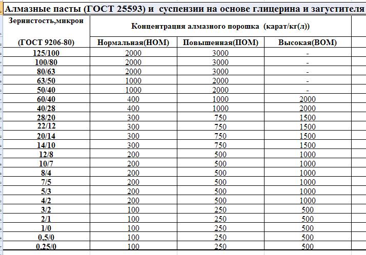 Теперь конкретно по параметрам. Насчёт брусков из того что нашёл в местных прайсах, отечественного производства есть вот это: Брусок абр. 64С БП 40-20-200 М50 СМ в ГОСТе к сожалению не указан размер зерна, но указан Параметр шероховатости обработанной поверхности Ra, мкм, не более 0,80. Вроде бы умные люди тут писали что зелёный карбид кремния да ещё на керамической связке это есть хорошо. Хотелось бы услышать мнение конкретно по данному образцу бруска. По поводу паст у нас есть как алмазные так и ГОИ (тоесть не совсем ГОИ, а сделанные по ТУ). То что у нас называется ГОИ доступна 4 разных классов, карточка выглядит примерно вот так: ГОСТ 2912-79 ТУ 6-18-36-85 Есть ещё куча разных алмазных паст, честно говоря времени разбираться с их характеристиками просто не было: Как вариант изготовитель предлагает просто порошок без основы, а так же полировальные смеси алмазного порошка на различных основах: что посоветуют знающие Люди? Также хотелось бы уточнить технику использования этих паст: как и на что мазать, в какой последовательности с другими абразивными материалами использовать и можно ли обойтись только пастами, вообще исключив камни? Спасибо.