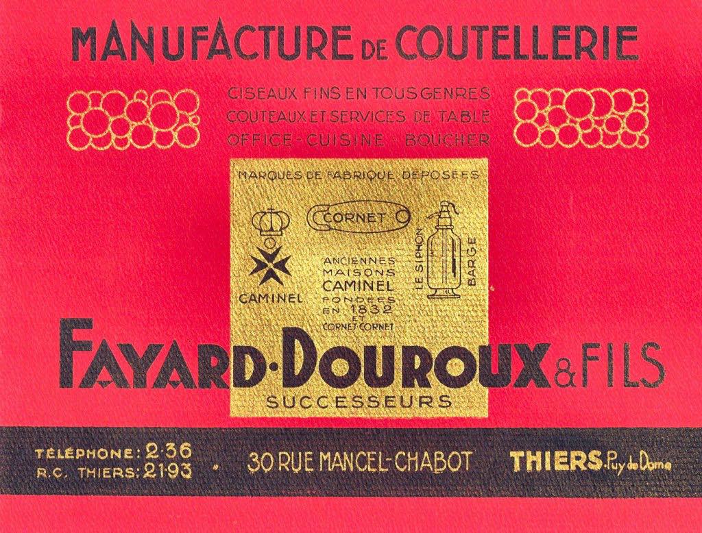 Все как обычно в каталогах ножи вилки (бритв правда нет). Spoiler Show La maison FAYARD DOUROUX reprend des anciens marquages, notamment ceux de la maison Cornet La production est essentiellement centrée sur les couteaux de table et de métiers de bouche; ainsi que des ciseaux . ссылка на яндекс диск. Spoiler Show PDF - 4.2 mb - https://yadi.sk/i/YvUr2maFjyaZu" onclick="window.open(this.href);return false;