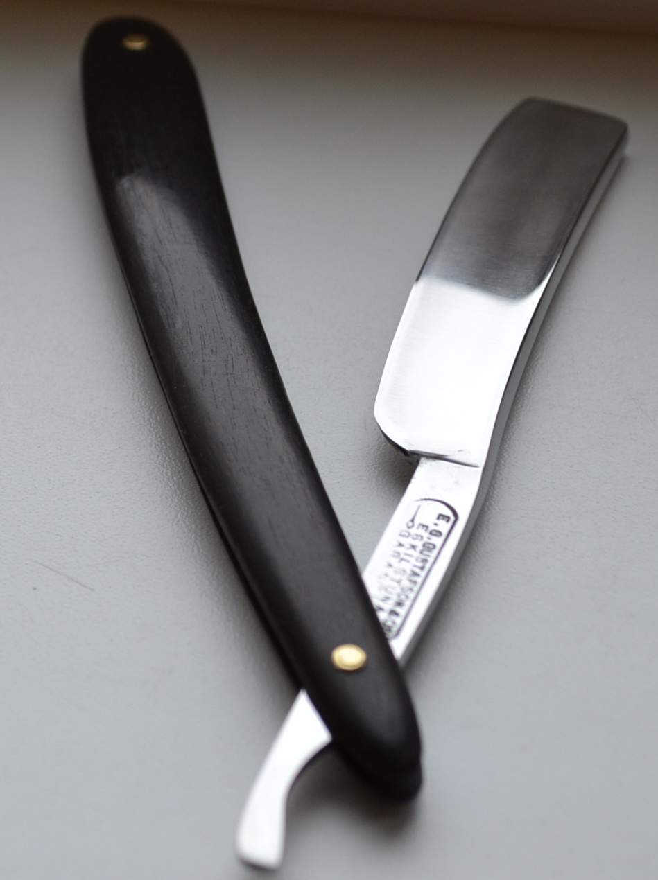 E.G. GUSTAFSON&Co Швеция, ширина 11/16, клин, ручка - дерево(эбен, оригинал), кожаный чехол, заточена и готова к бритью. продано GUSTAFSON Show Re: Продаётся от FransБритву ssa шведку и точилку сегодня получил, очень рад- большое спасибо. Шведская сталь просто не подражаема а ручка ручной работы из натуральных материалов это как раз то чего не достает шведским бритвам. Ни англичане ни французы до сих пор не рассказали им где брать сырье. После испытания в работе -просто пять баллов по пятибальной шкале. От точилки тоже в восторге очень тонкая работа никогда такой не было- пока не испытывал. Обычно два альпинистскиих карабина амеж ними ремень. Пора привыкать к лучшему. Еще раз спасибо.