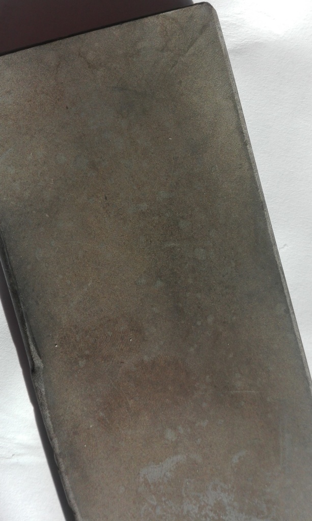 Следующий камень предположительно чарли форестер, на улице пасмурно лучше мобильным сделать фото не получается... Камень твердый, суспензию сам по себе не дает, если наводить чем то твердым то молочная еле сероватая. Мне два камня выдали, два заявлены как чарли форестеры, тот, что больше похож на чарли я уже опробовал стоят одинаково длинна ок. 9 дюймов ширина 2 дюйма, но этот можно распилить вдоль или на худой конец сурик с него отпилить, с первым такое не проделаешь там нижняя сторона вся побитая как у булыжника с мостовой и отслоения после выравнивания вылезли боюсь, что распиловку не переживет... Цвет камня темно-зеленый (если намочить особо зеленеву видно) цветом похож на чарли форестер, но у того зеленого чарли есть разводы красноватые (бурые), а у этого нет только на обратной стороне есть черное пятно (по которому его и определили как чарли, есть маленькие расплывчатые черные пятнышки), на лицевой стороне видно полупрозрачную прожилку есть трещинки и отслоения (как и у другого чарли). Камни при заточки вели себя "кажись одинаково", заточник бритв с меня еще не очень потому и "кажется". Брить после второго камня нет чего у продавца один чарли я купить не успел (тот был больше и весь полосатый как зебра) вот и второй у него берут, хочу себе третий взять потому вопрос - кто нибудь находил инфу (или в руках держал) о зеленых чарли форестерах с черными пятнами?