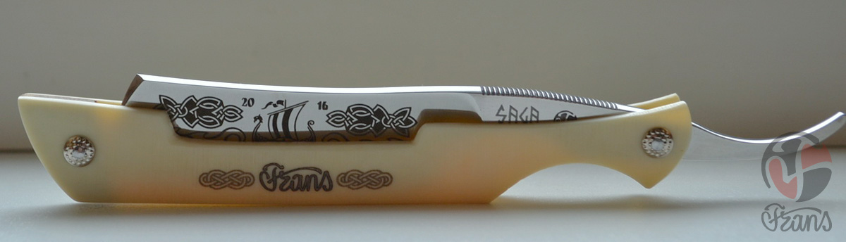 Проект Saga На скандинавскую тему. Участники те же. Frans, GVIk, Toivo Изменилась контора по лазерной гравировке. Ширина : 6/8, вогнутость 1/2, ручка - бивень моржа(нарочито грубая обработка) Серийный номер: Sa001