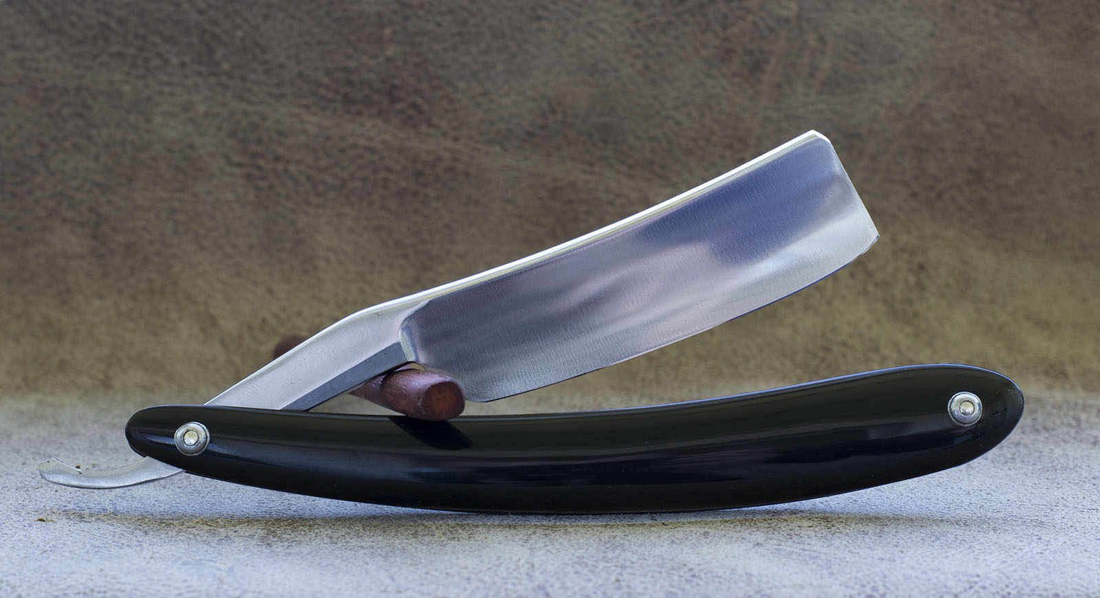Ширина бритвы 18.5 мм. Новая роговая рукоять, обушок и эрл с дополнительными гранями, придающими неповторимую форму спинке. Бритва середины 19 века и как это часто бывает, рукоять не дожила до наших дней, была изготовлена новая из рога буйвола. Продано Spoiler Show