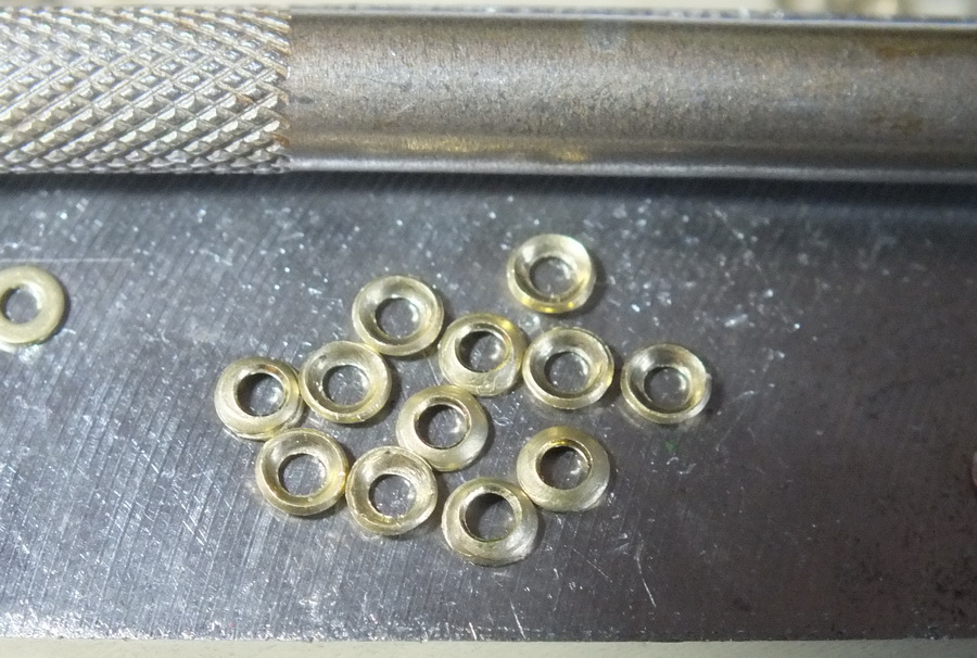 Заказал у врагов заокеанских: http://www.microfasteners.com/fwb0-0-fl ... brass.html Пришли оперативно, всего две недели. Немножко доработал их ибо плоские совсем, а это не есть гуд. Выбрал в наковальне (сменная губа для тисков) полусферу и пуансон соорудил соответствующий. Результат на фото. Конечно далеко от заводского вида, но все же неплохо.