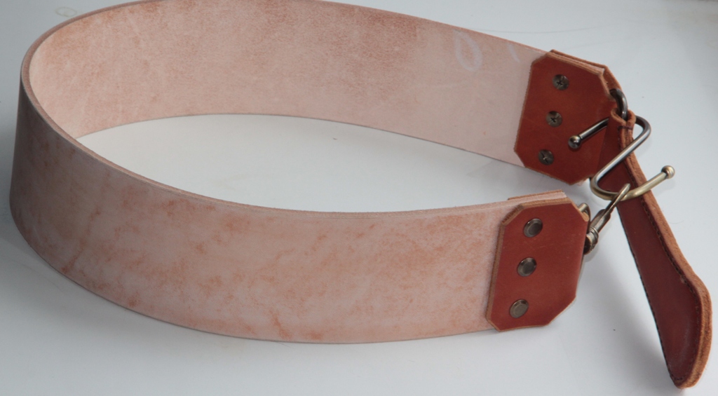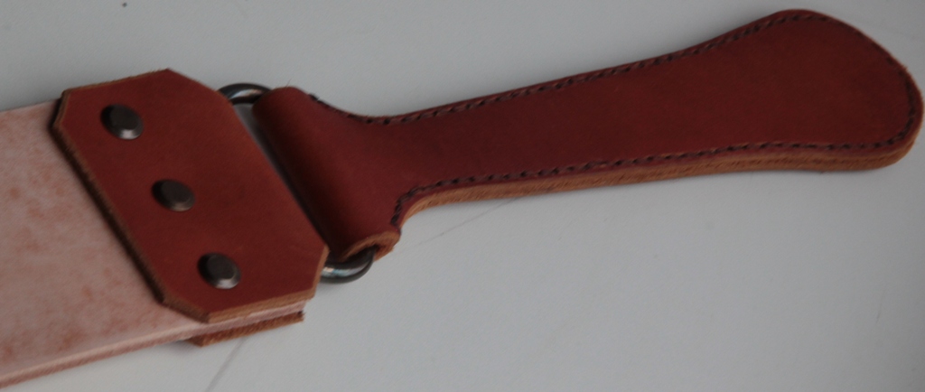 Рабочая часть ремня выполнена из качественного получепрака растительного дубления, кожа отшлифована до 2000 грит и полностью подготовлена для работы, обработана костным маслом. Кожа плотная, упругая и главное рабочая. Обвязки фурнитуры, ручка выполнены из натуральной кожи, надежно фиксируются винтами к рабочей части ремня. Ручка прошита седельным швом, в руке сидит как влитая, очень удобная. Для большей надёжности в ручку вшита металлическая пластина.