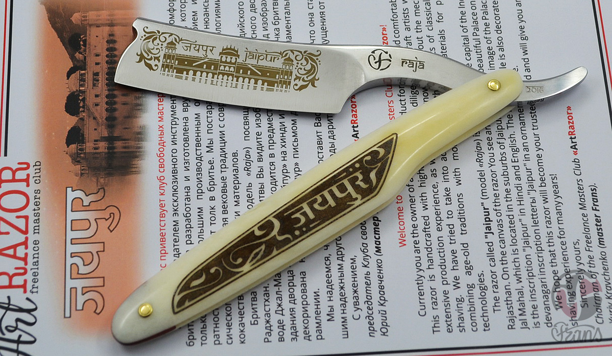 Бритва в индийском стиле RAJA Frans, Toivo, Gipson Сталь - У-12 Ширина - 7/8 Вогнутость - Клин Ручка - кость(верблюд) Лазерная гравировка металл/кость Не продана
