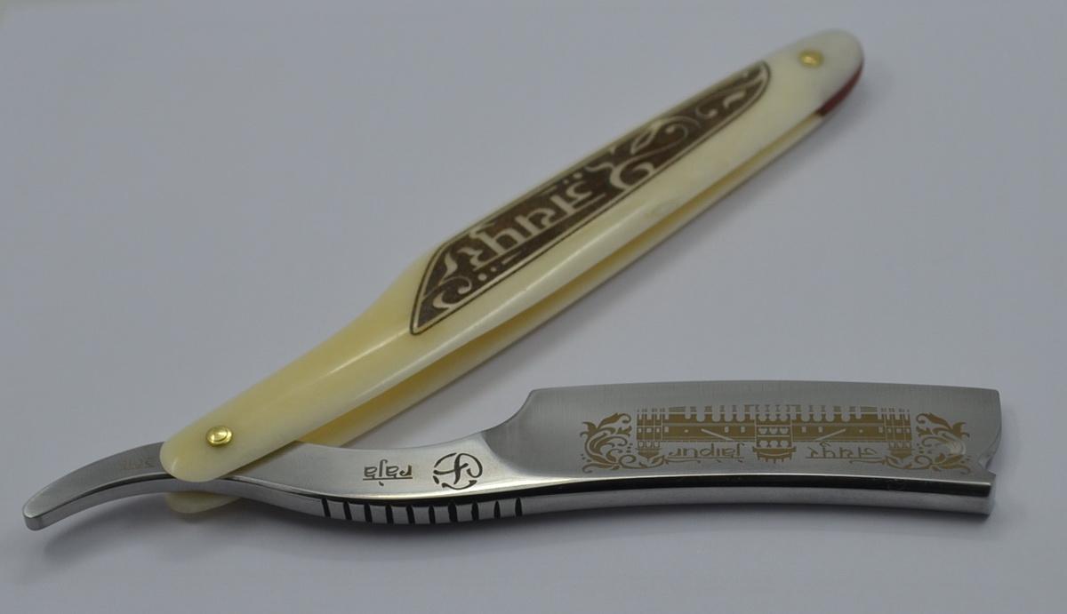 Бритва в индийском стиле RAJA Frans, Toivo, Gipson Сталь - У-12 Ширина - 7/8 Вогнутость - Клин Ручка - кость(верблюд) Лазерная гравировка металл/кость Не продана
