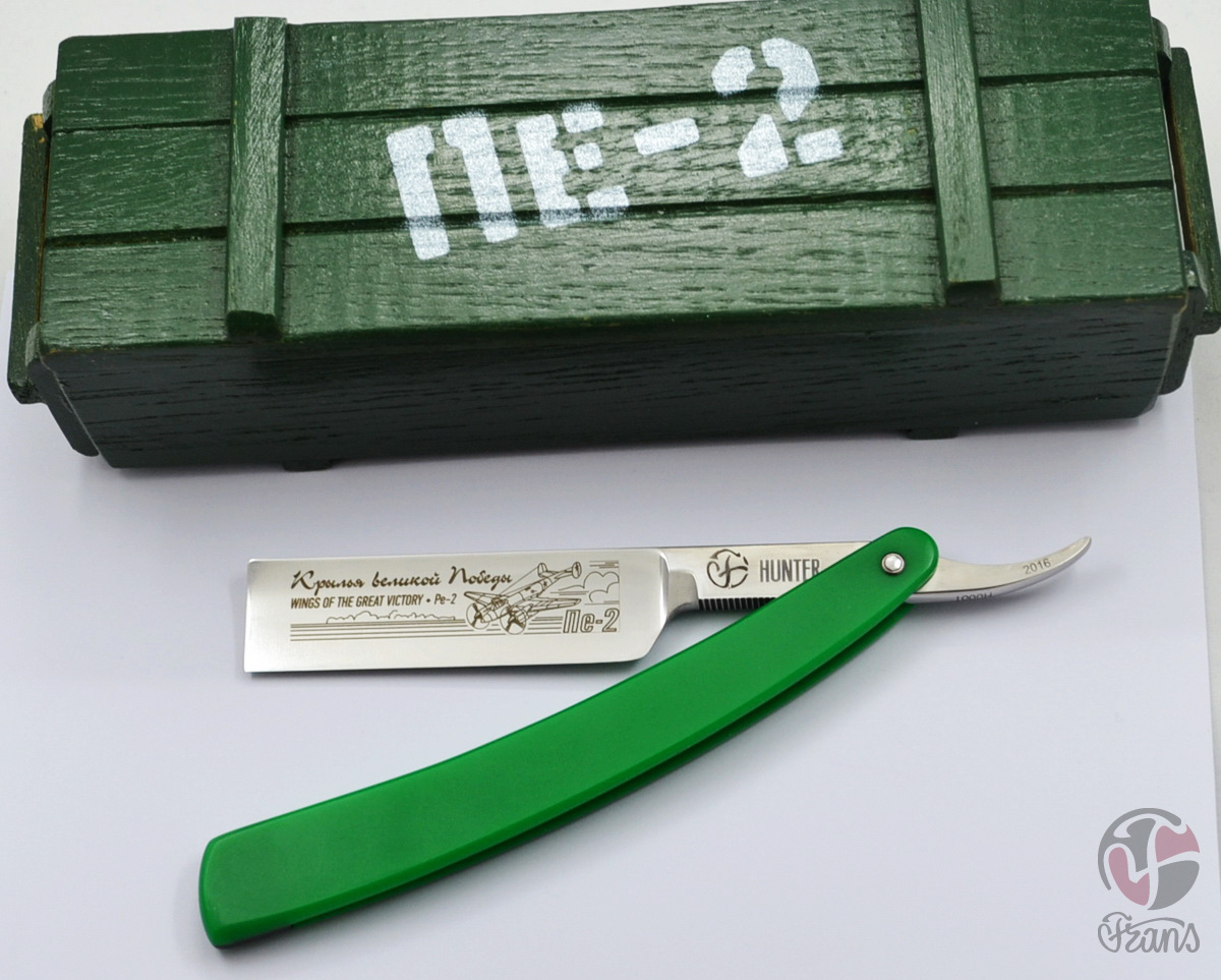 Продолжаем авиационную серию. Бритва: HUNTER Пе-2 Сталь: Uddeholm Arne(Швеция) Ширина - 6/8 Вогнутость - 1/4 Ручка - акрил(матовый) Ящик "Пе-2" - дуб