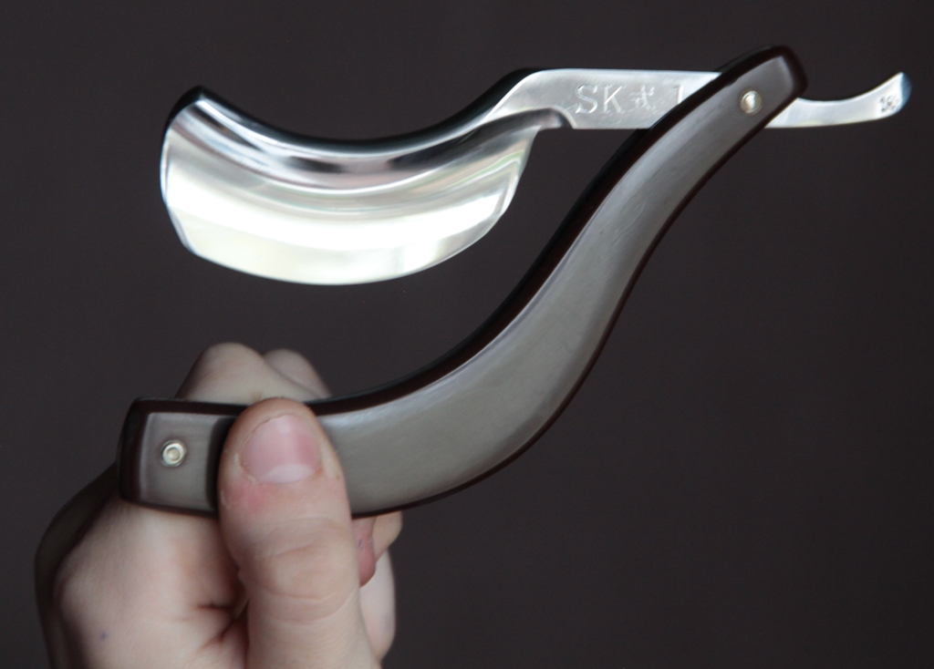 Также были мысли с сложности заточки такой бритвы, т.к. кромка не ложится всей плоскостью на камень и нужно будет приподнимать по очередности носик и пятку( как при заточке клина), но заточка прошла совершенно без проблем, как я считаю, опять таки, за счёт идеальной формы лезвия.Бритьё получилось чистое, мягкое без раздражения. Короче, бритва понравилась во всех смыслах: как с точки зрения эстетики и уникальности самого экземпляра, так и практической стороны.