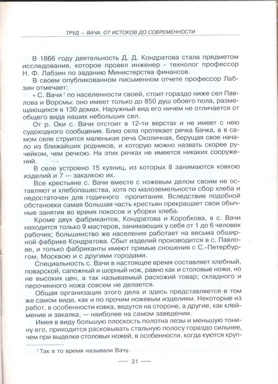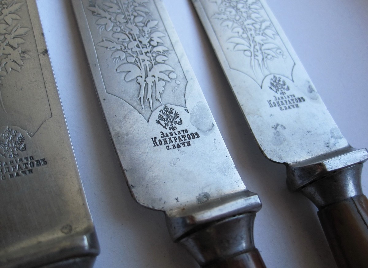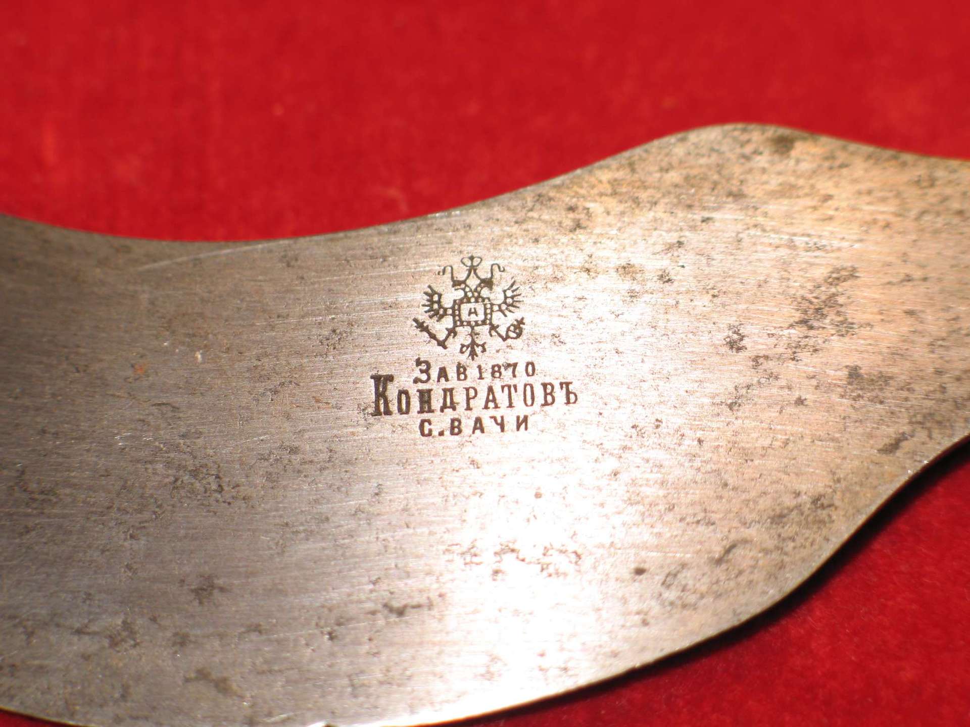 Аукционы: плагиат, развод и "великолепные" описанияСудите сами...источник официальный Среди владельцев «заводов» выделились местные крестьяне Кондратьевы. Д. М. Кондратьев в 1831 году работал по найму у павловских мастеров, а в середине тридцатых уже основал в Ваче «ножевую фабрику». Его сын Д. Д. Кондратьев расширил производство отца, и на его «фабрике» в начале пятидесятых годов работало, не считая надомников, восемьдесят пять работников. Они выпускали продукции на двенадцать тысяч рублей. Через десять лет на этой фабрике была паровая машина и работало уже сто шестьдесят человек и триста являлись надомниками. Продукция оценивалась в семьдесят тысяч рублей в год. http://www.museum.murom.ru/wwwmus/afish ... /pr_28.htm