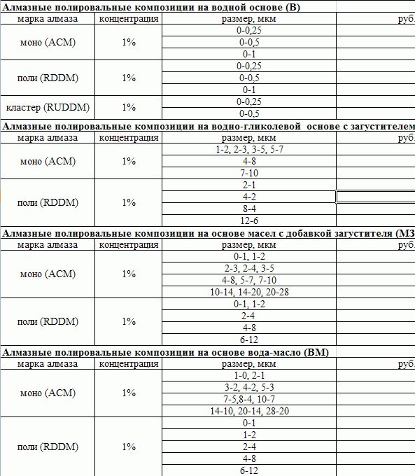 Теперь конкретно по параметрам. Насчёт брусков из того что нашёл в местных прайсах, отечественного производства есть вот это: Брусок абр. 64С БП 40-20-200 М50 СМ в ГОСТе к сожалению не указан размер зерна, но указан Параметр шероховатости обработанной поверхности Ra, мкм, не более 0,80. Вроде бы умные люди тут писали что зелёный карбид кремния да ещё на керамической связке это есть хорошо. Хотелось бы услышать мнение конкретно по данному образцу бруска. По поводу паст у нас есть как алмазные так и ГОИ (тоесть не совсем ГОИ, а сделанные по ТУ). То что у нас называется ГОИ доступна 4 разных классов, карточка выглядит примерно вот так: ГОСТ 2912-79 ТУ 6-18-36-85 Есть ещё куча разных алмазных паст, честно говоря времени разбираться с их характеристиками просто не было: Как вариант изготовитель предлагает просто порошок без основы, а так же полировальные смеси алмазного порошка на различных основах: что посоветуют знающие Люди? Также хотелось бы уточнить технику использования этих паст: как и на что мазать, в какой последовательности с другими абразивными материалами использовать и можно ли обойтись только пастами, вообще исключив камни? Спасибо.