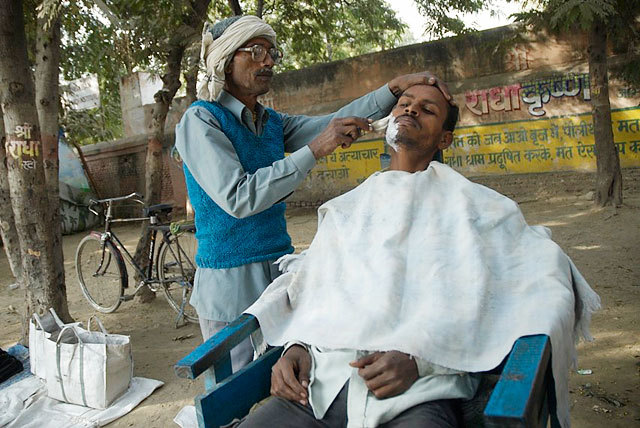 Re: Интересные фотоЧто бы как то разрядить обстановку. В Индии повсеместно встречаются уличные парикмахеры и брадобреи. Вешают зеркало на улице прямо на заборе и ставят стул. Клиент садится и его бреют опасной бритвой. Этот же сидел прямо на краю дороги в центре города.