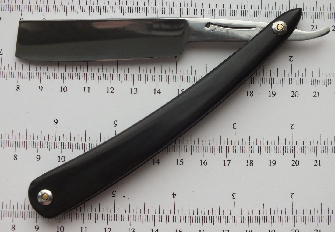 Клинок уставший. Но вполне ремонтопригоден. Оправу сделал заранее, пока бритва ехала с Украины. Рог от Boris, полосатый (черно-коричневый). Вытяжные заклепки из нержавейки М2. Клинышек ПОС-61. Вся работа занята шесть часов. Вот что вышло: 32 года активно мусолю харю клинковой бритвой