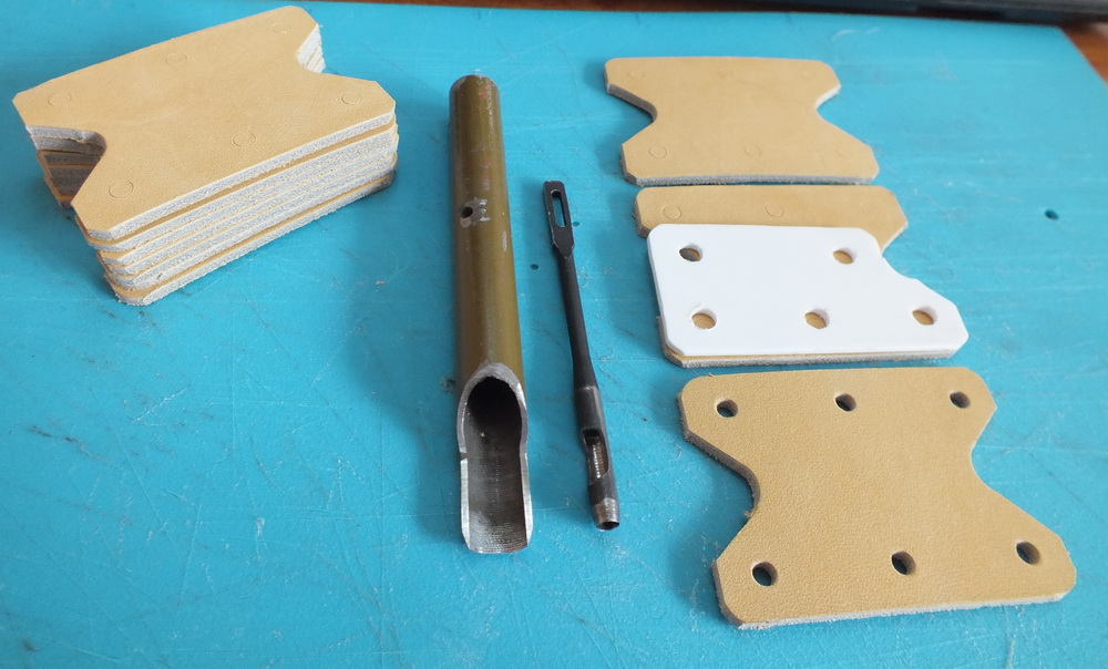 Работа получается аккуратная и однообразная. И изготовить вырубки разных диаметров. У меня две. Диаметром 9 мм., для закруглений и 3 мм. для заклепок. 32 года активно мусолю харю клинковой бритвой