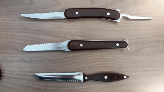 Спасибо, сам очень доволен, особенно сохраном, не с консервации конечно, но уточки и побитости свайки нет совсем , четко фиксируются во всех положениях, клеймо четкое.. Правда это не боцманский , а шлюпочный из комплекта шлюпочной укладки, но они по моему еще реже встречаются чем боцманские — особенно СН овские — в 70 годы на Октябрь их производство отдали , а там и качество похуже и накладки из пластика. Продаван похвастплся еще шкерочным для разделки рыбы который сам урвал с утра , но отдавать отказался категорически , а нож уникальный "перевертыш" , я такой впервые увидел Нашел потом фотку в инете — он посередине