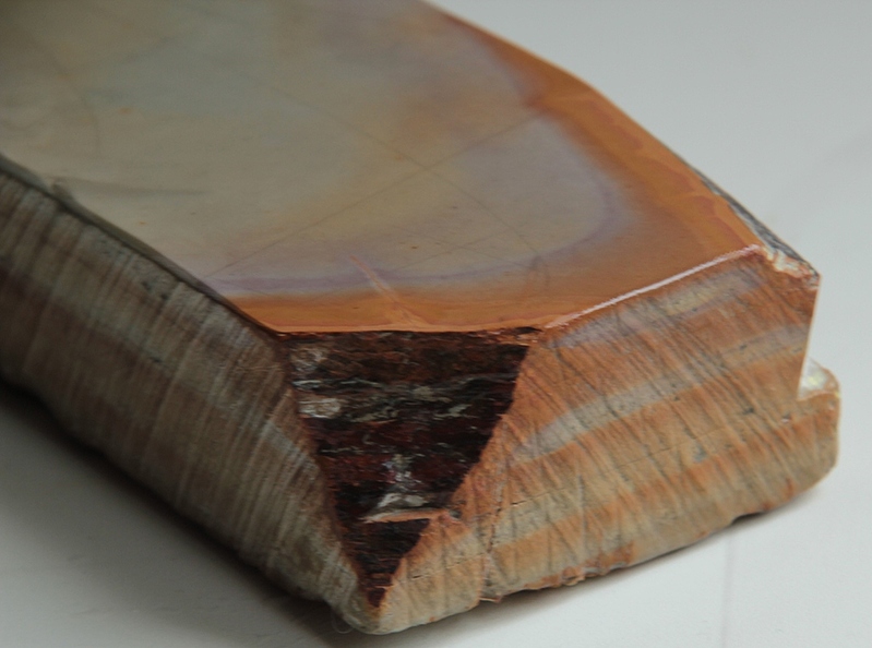 Очень красивый оттенок рабочей поверхности.На сухую, камень имеет приятный цвет Асаги, с едва уловимыми фиолетовыми кольцами по краям и коричневой окантовкой(типа Киита). При работе с водой, камень открывает ещё и зеленоватый оттенок и заметным проявлением фиолетового по краям.